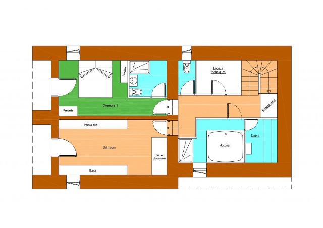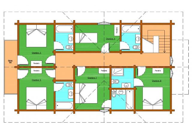 Le chalet comprend 8 chambres avec salle de bain /wc privatives, il est équipé d’une salle de détente avec sauna, jacuzzi et douche.