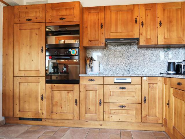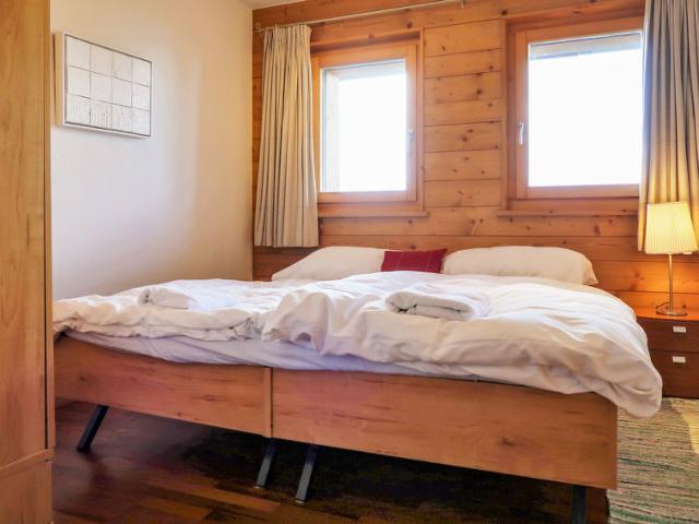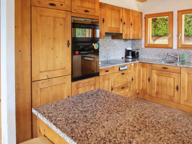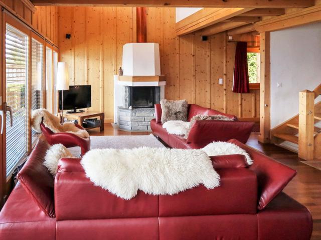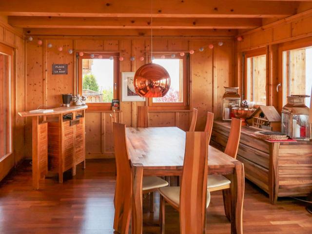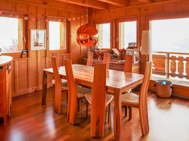 Chalet 6 pièces 220 m2 sur 3 niveaux. Spacieux, aménagement confortable: grand séjour/salle à manger avec cheminée, bar et TV (câblée). Sortie sur le balcon, sur la terrasse, orientée nord et orientée ouest. Cuisine ouverte (four, lave-vaisselle, 4 plaques vitrocéramique, congélateur, cafetière électrique, Capsules pour machine à café (nespresso) (NON INCLUSES), four à vapeur) avec bar. WC séparé. À l'étage inférieur: 1 chambre avec 2 x 2 lits superposés (90 cm, longueur 200 cm). 1 grande chambre avec 1 lit double (2 x 90 cm, longueur 190 cm), douche/WC. 1 chambre avec 1 lit double (180 cm, longueur 200 cm). Bain/WC. À l'étage supérieur: 1 grande chambre avec 1 grand-lit (200 cm, longueur 200 cm), bain/douche/WC et double vasque. Sortie sur le balcon, orientée sud et orientée nord. Bureau ouvert. Balcon, situation nord, terrasse, situation sud et situation ouest. Très belle vue sur les montagnes et la vallée. A disposition: chaise haute pour enfant, lit bébé. Internet (Connexion WIFI). Garage (2 Voitures). Veuillez noter: maison non-fumeur. Piano.