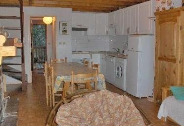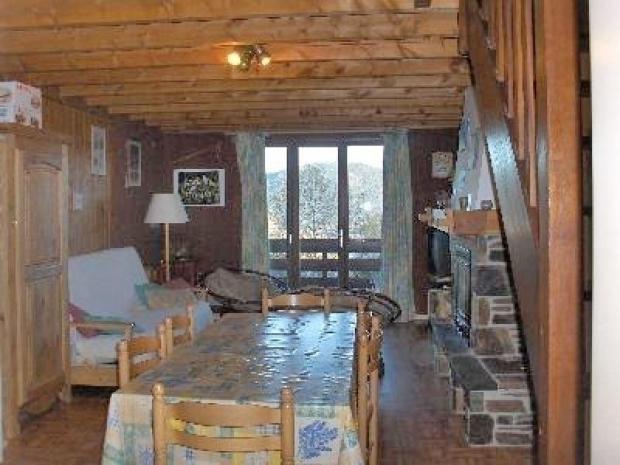 Chalet mitoyen 70 m ² avec balcon vue lac, accessible par 4 marches, avec entrée, salle d'eau/WC, séjour avec coin salon (insert cheminée, clic-clac,, TV), coin cuisine équipé (4 plaques, four, réfrigérateur, micro-ondes, lave-linge, lave-vaisselle, hotte), cabine fermée (2 lits superposés). Au 1er : chambre (1 lit 140 + 1 lit d'appoint), 1 chambre (2 lits 90), salle de bains/WC (lavabo, baignoire, WC).