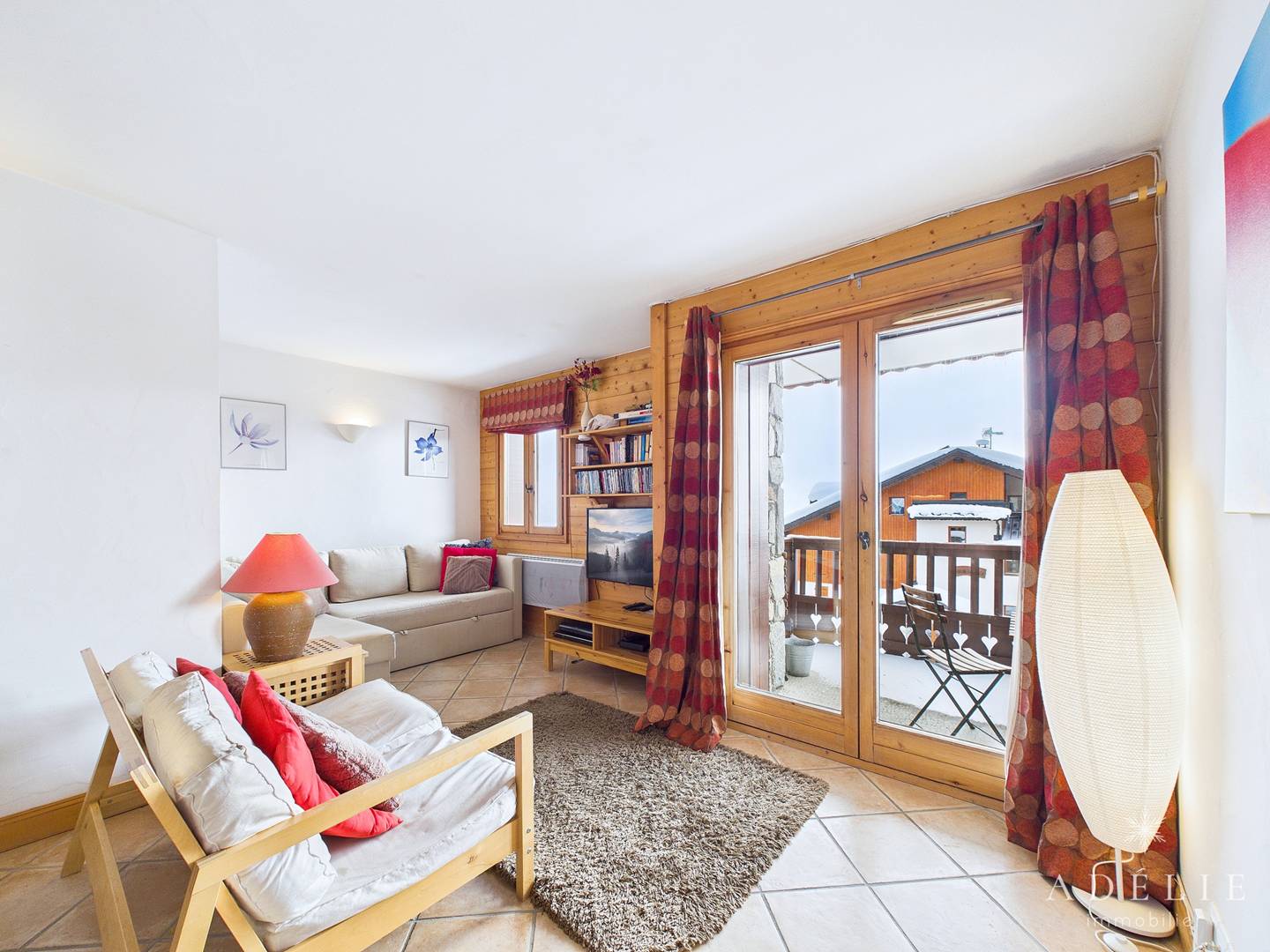 Balcon exposé Sud avec vue sur les montagnes environnantes. Au 3e niveau de l'immeuble avec ascenseur, de plein pied par l'entrée. Résidence au pied des pistes et à 150m des commerces. Casier à skis.