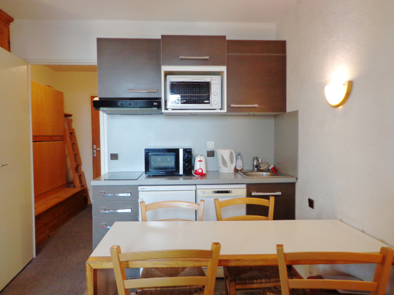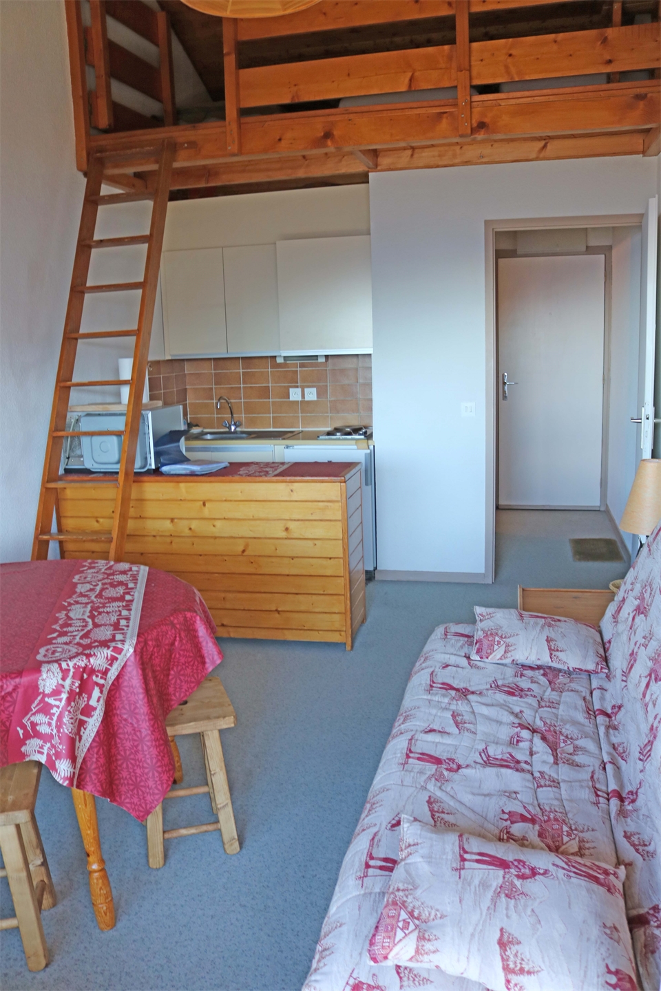 Studio de 23m², 3 personnes, avec une cuisine équipée dans l'entrée, salon avec un lit double rabbatable, un lit gigogne 2 pers.,1 lit simple rabbatable, télévision. Une salle de bain avec baignoire et wc.
