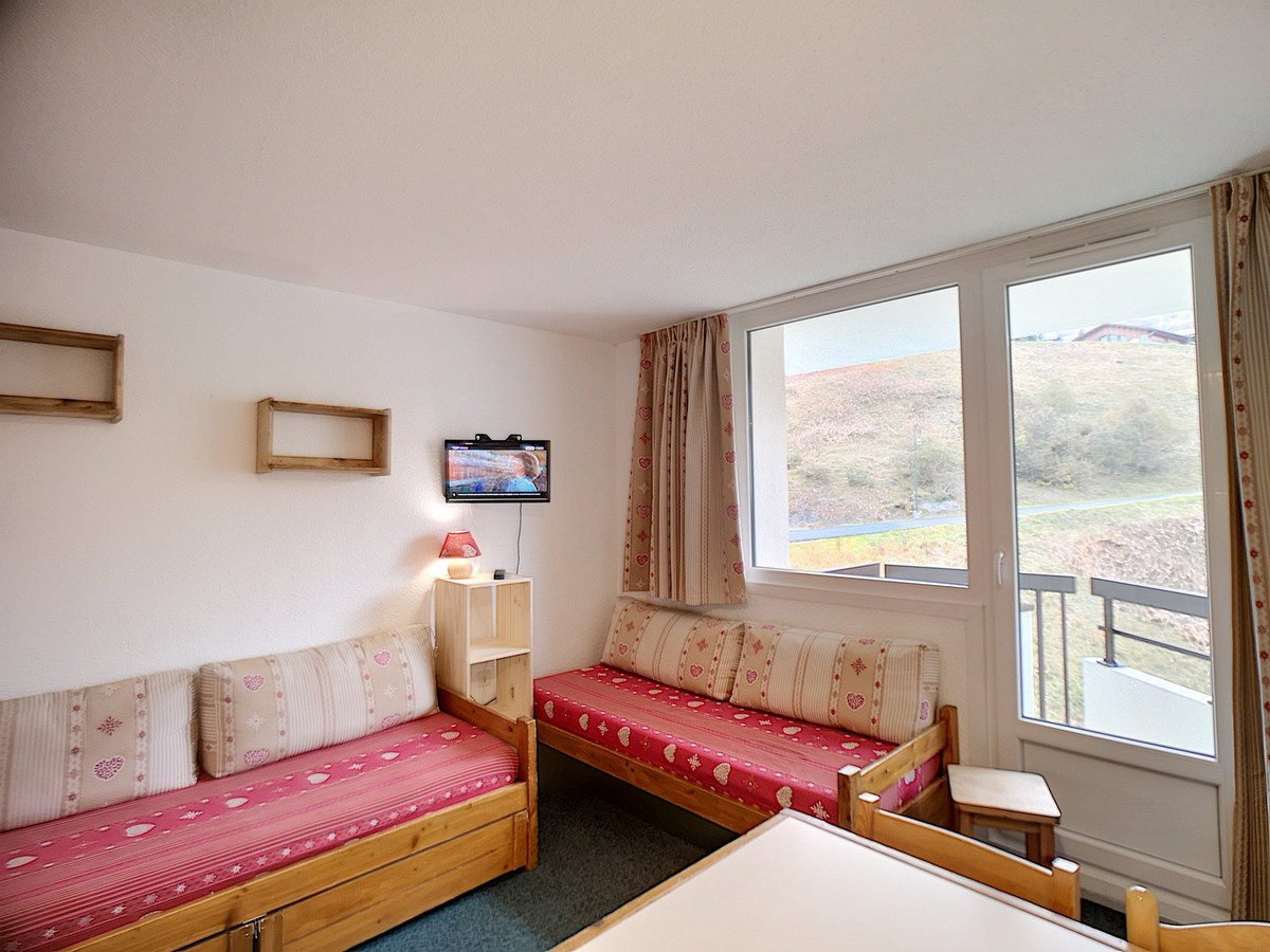Studio avec coin montagne pour 4 personnes de 18m2, au 3ème étage, avec balcon exposé Est. Couchages: lits superposés dans l'entrée, 2 lits simples + 1 lit gigogne dans le séjour.