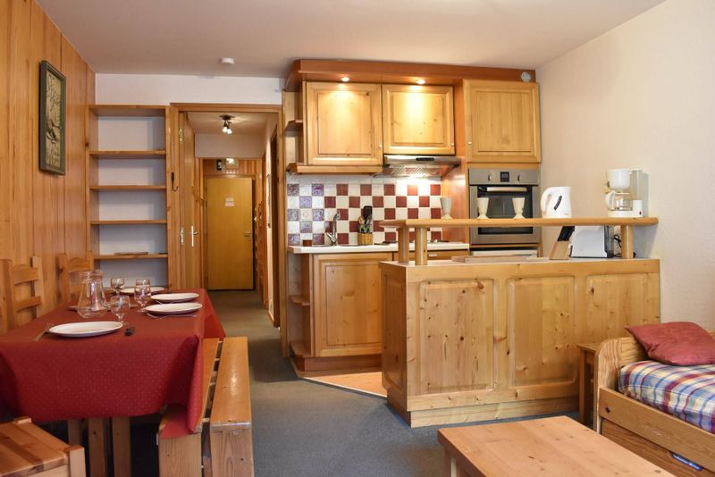 Cet appartement studio, situé au deuxième étage sans ascenseur (entrée par le 4ème étage) comprend 1 séjour avec un ensemble de lits gigognes relevables et télévision, une entrée avec un ensemble de lits superposés, 1 coin cuisine équipé d'un lave-vaisselle, une salle d'eau et un wc séparé ainsi qu'un casier à ski au niveau de l'entrée.
