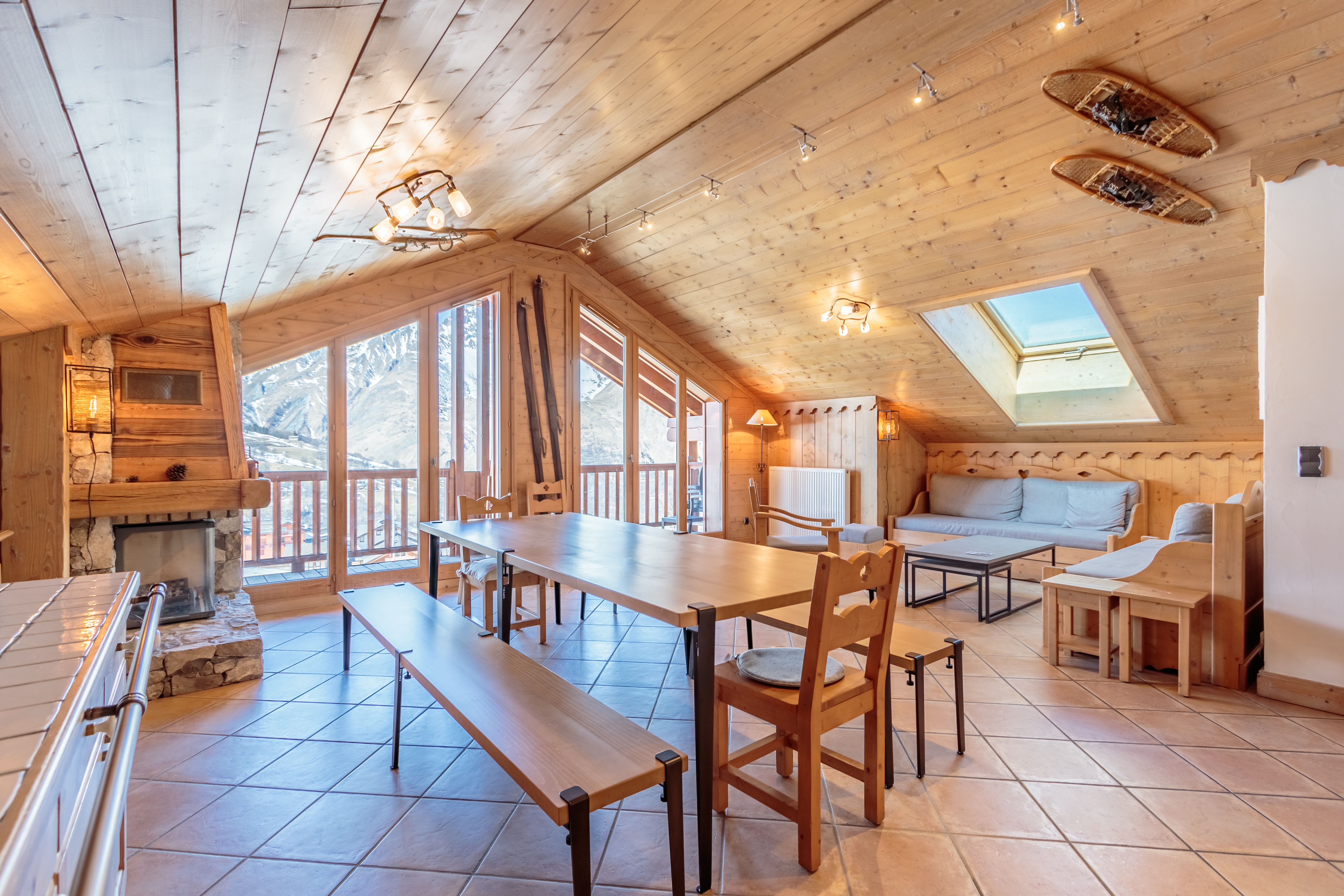 - Séjour avec télévision et lecteur DVD, balcon exposé SUD-OUEST, vue VILLAGE, au 1er ÉTAGE. Terrasse de 32 m²