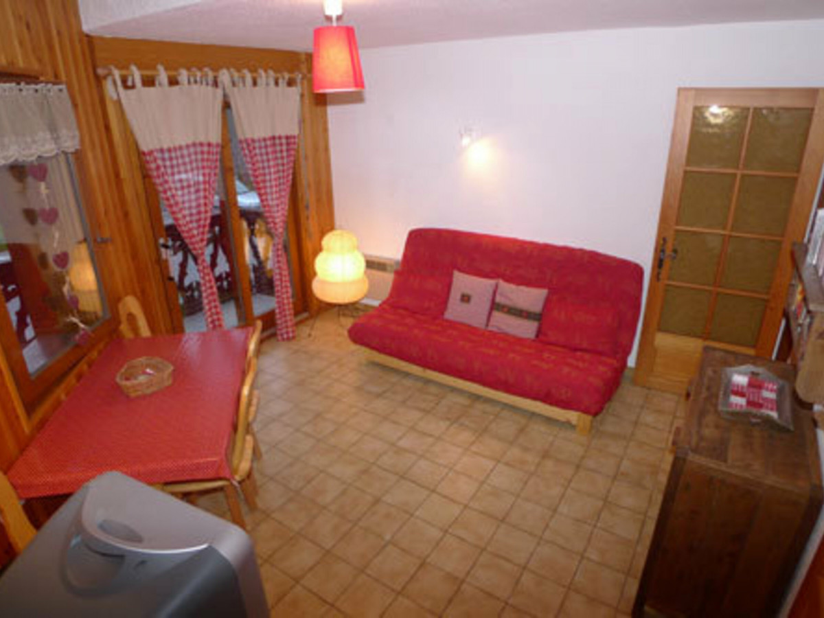 Séjour (12,10m2, 1 baie vitrée, Est, vue montagne-vallée) : Canapé clic-clac, TV ;