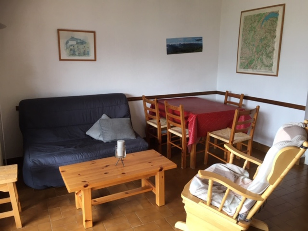 - Un séjour (12m2 expo Sud, une porte-fenêtre et fenêtre, vue : jardin et copropriété, montagnes) avec canapé clic-clac et kitchenette équipée (plaques cuisson, four, petit micro-onde, lave-vaisselle, réfrigérateur, donnant sur un agréable balcon 6m2)