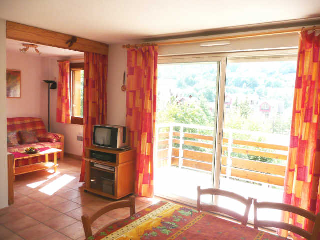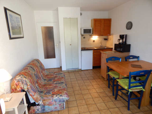 Cet appartement orienté Sud, est composé d'une salle d'eau avec douche et wc non séparés, d'un coin montagne avec lits superposés, d'un séjour donnant accès au balcon avec vue panoramique, d'une kitchenette équipée d'un micro-ondes, un réfrigérateur, 2 plaques vitro, cafetière electrique... d'une chambre avec lit-tiroir (2 lits une personne)