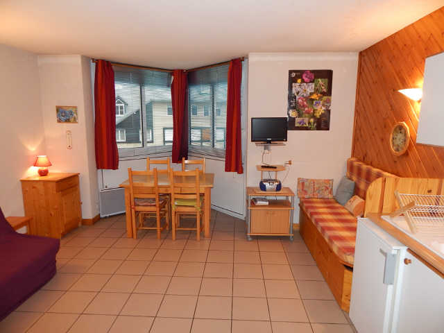 Il se compose d'un séjour avec coin cuisine, canapé lit 2 personnes et un canapé lit 1 personne, d'une salle de bains avec WC. Vue sur le Fort et les montagnes. Casier à ski.