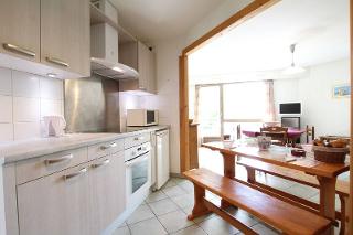 Ce grand studio pour 4 personnes s'organise de la manière suivante : un séjour avec un canapé-lit pour deux personnes, une télévision, un lecteur DVD et une chaîne stéréo, deux lits superposés dans le coin montagne, un coin cuisine équipé d'un lave-vaisselle et une salle de bain avec WC séparés. Possibilité de garer votre véhicule sur le parking extérieur de la résidence.