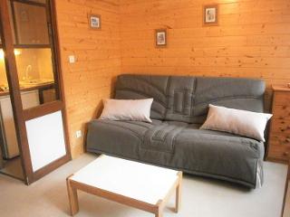 Séjour avec un canapé-lit 2 personnes, Télévision Petite chambre avec 2 lits superposés Kitchenette équipée avec 2 plaques électriques, four électrique, micro-ondes, cafetière, bouilloire électrique et grille pain Salle de bains (baignoire sabot) - wc séparés Casier à skis n°23 - Parking devant la résidence