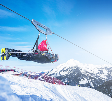 Parmi de nombreuses activités au ski, à la Plagne 8 tyroliennes attendent les amateurs, et le parcours se finit par un Base Jump.