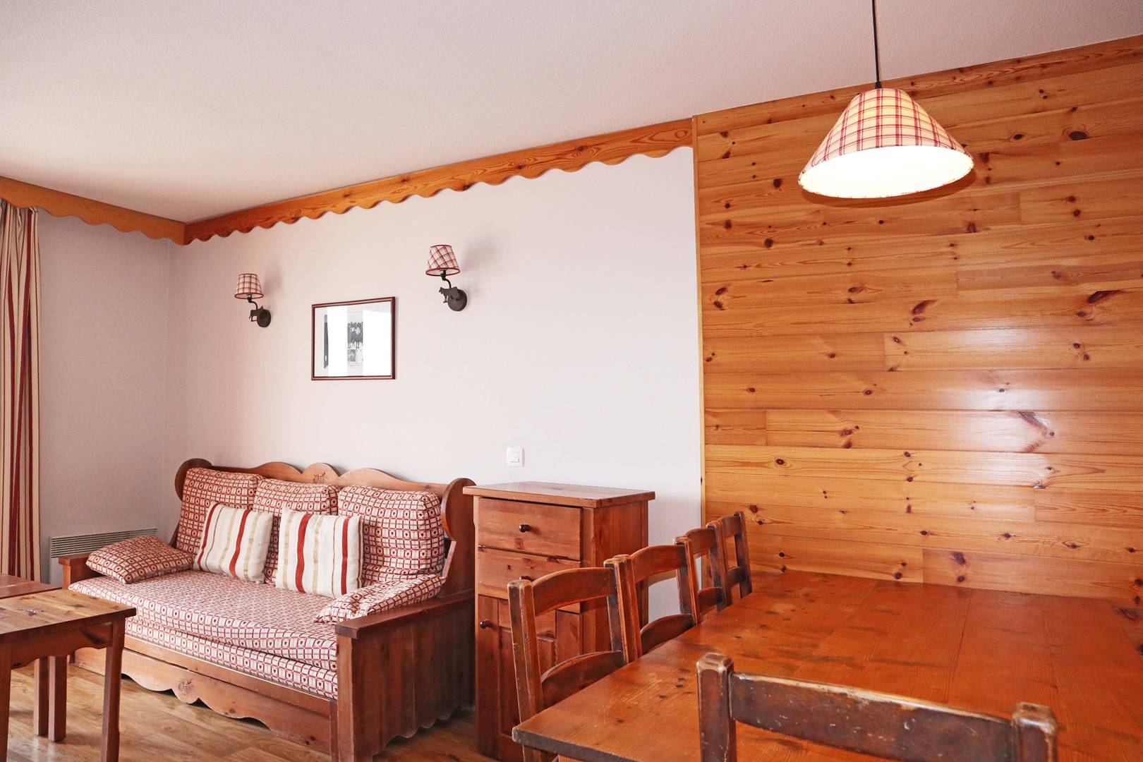 Dans la résidence Les Gradins sur la place centrale, départ skis aux pieds. Studio équipé pour 4 personnes situé en cœur de station au cinquième étage avec ascenseur comprenant une entrée avec 2 lits superposés 1 place, un séjour avec 1 banquette convertible 2 places, un coin cuisine, une salle de bains et wc séparés. Balcon exposition Sud avec une très belle vue dégagée. Accès direct à tous les commerces et à la place centrale de la station.