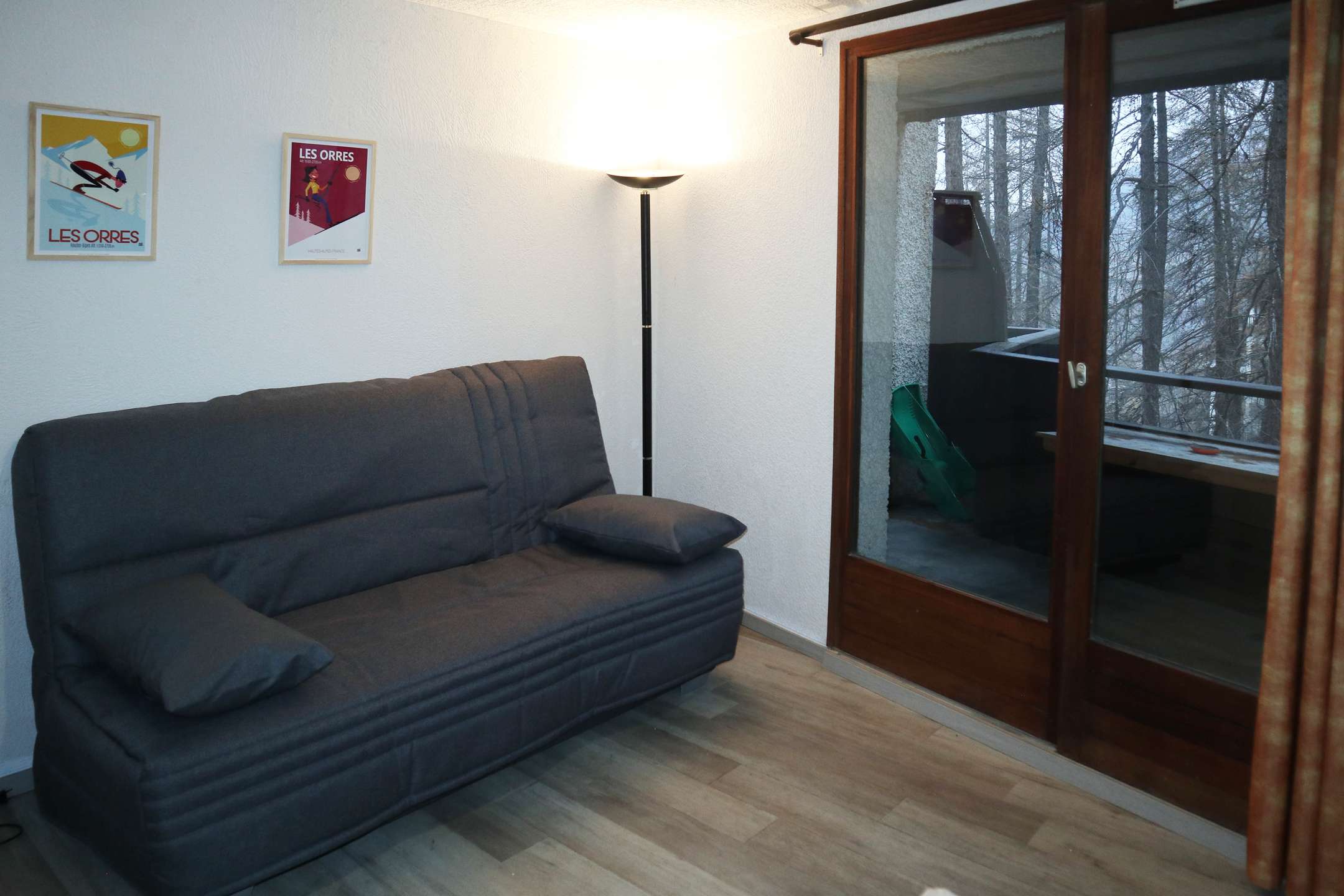 LES ORRES 1800 - Grand Appartement de bon confort dans une résidence de standing avec piscine et sauna, à proximité des pistes et des commerces, équipé pour 6 personnes comprenant une chambrette avec 2 lits 1 place, une chambre séparée du séjour par une cloison coulissante avec 1 lit 2 places avec salle d'eau, un séjour une banquette convertible 2 places, un coin cuisine, une salle de bains et WC indépendants, balcon exposition Sud/Est.