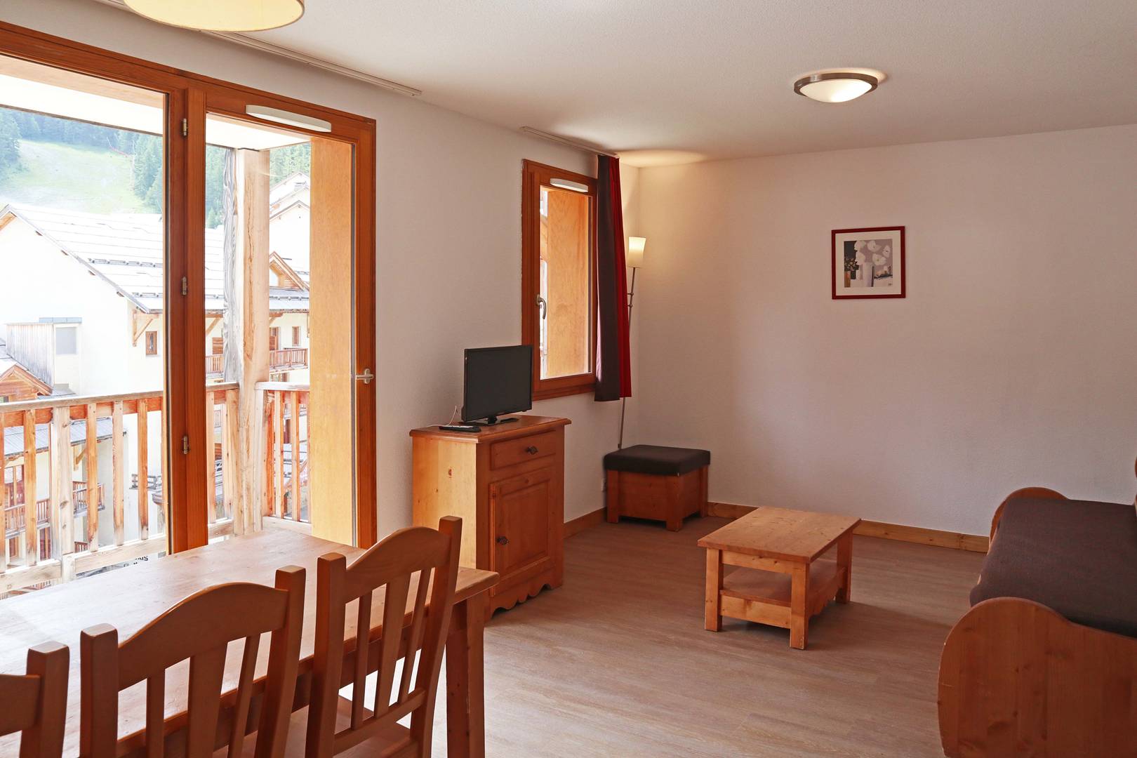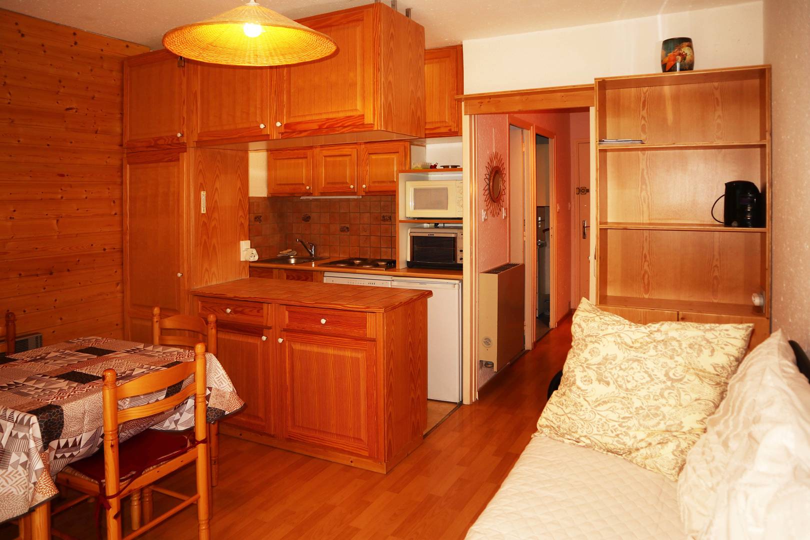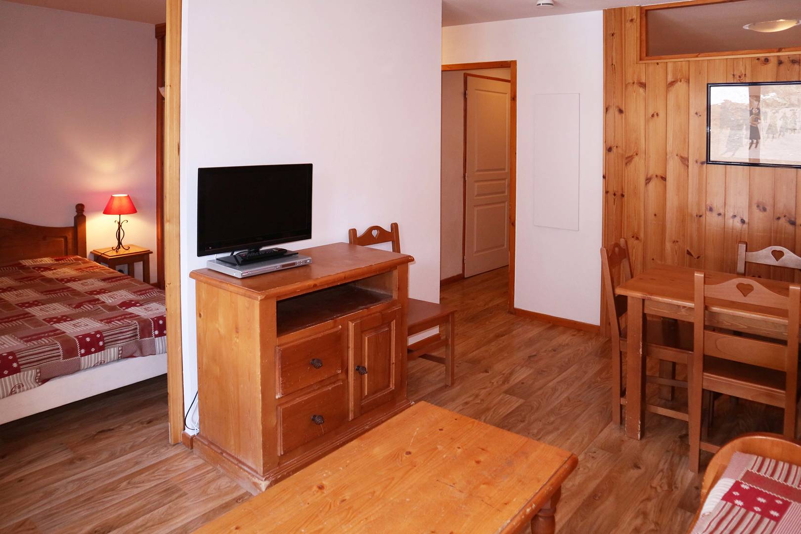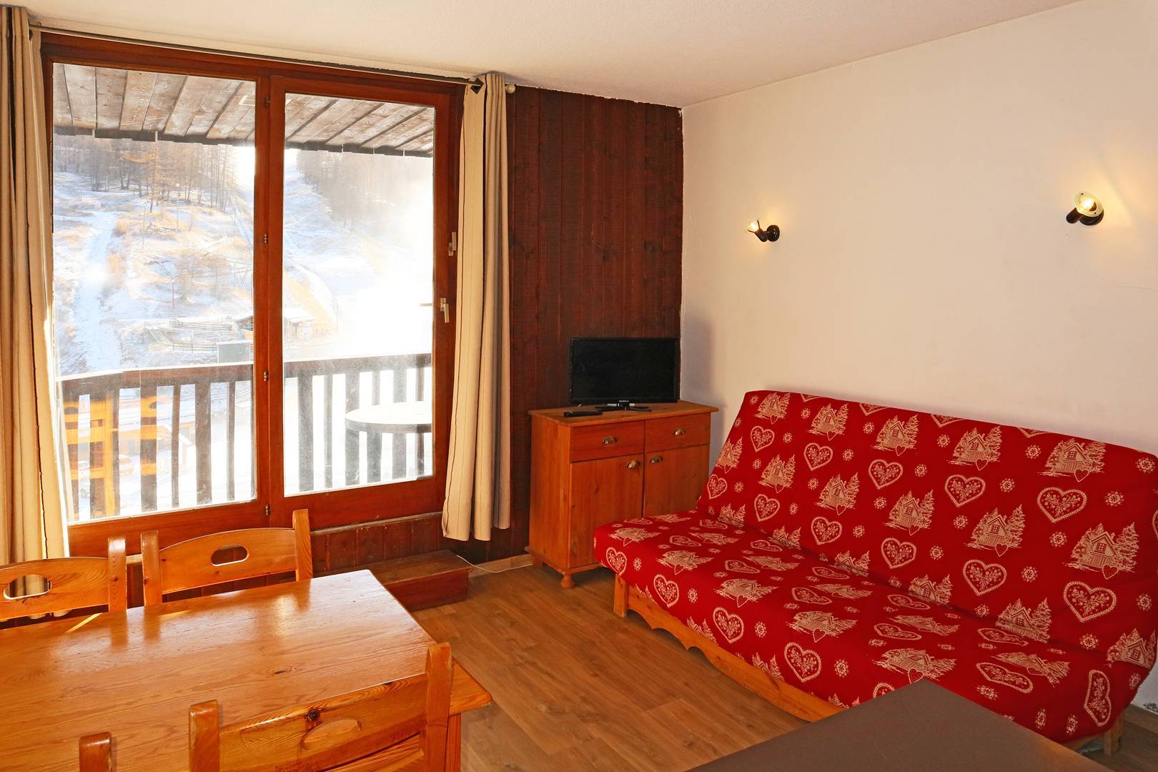 Studio équipé pour 4 personnes composé d'une entrée avec 2 lits superposés 1 places d'un séjour avec 1 banquette convertible 2 places, salle de bains et wc séparés, coin cuisine ouvert sur le séjour, balcon exposé sud offrant une très belle vue pistes.