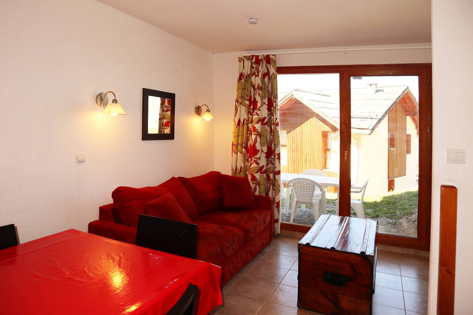 LES ORRES 1800 m - Appartement de bon confort dans cette résidence de standing avec piscine extérieure chauffée et sauna, à proximité des pistes et des commerces, équipé pour 6 personnes comprenant 1 chambrette avec 2 lits 1 place, une chambre séparée du séjour par une cloison coulissante avec 1 lit 2 places, un séjour avec une banquette convertible 2 places, un coin cuisine, une salle de bains et wc séparés. Balcon exposition Nord Ouest. 1er étage.
