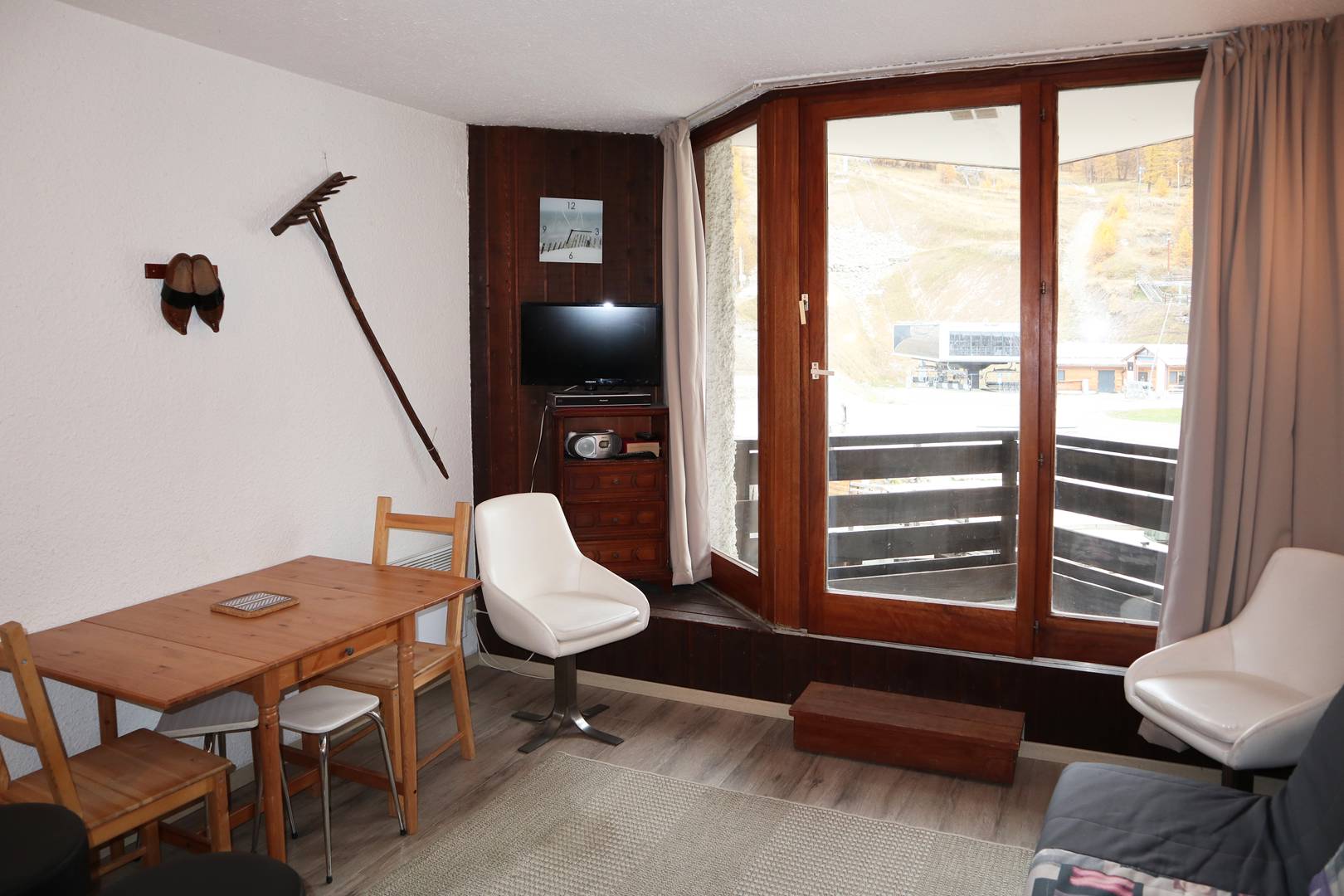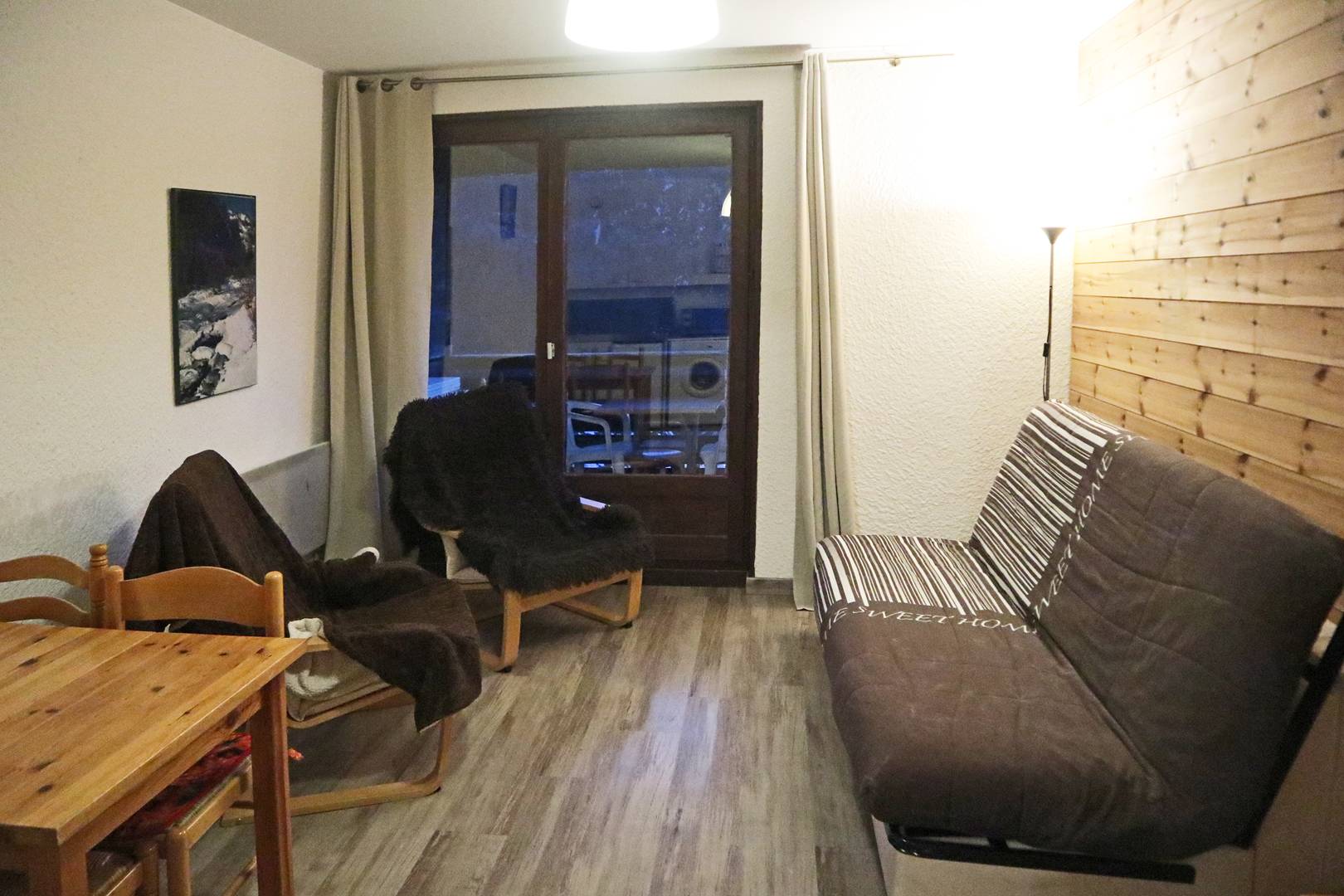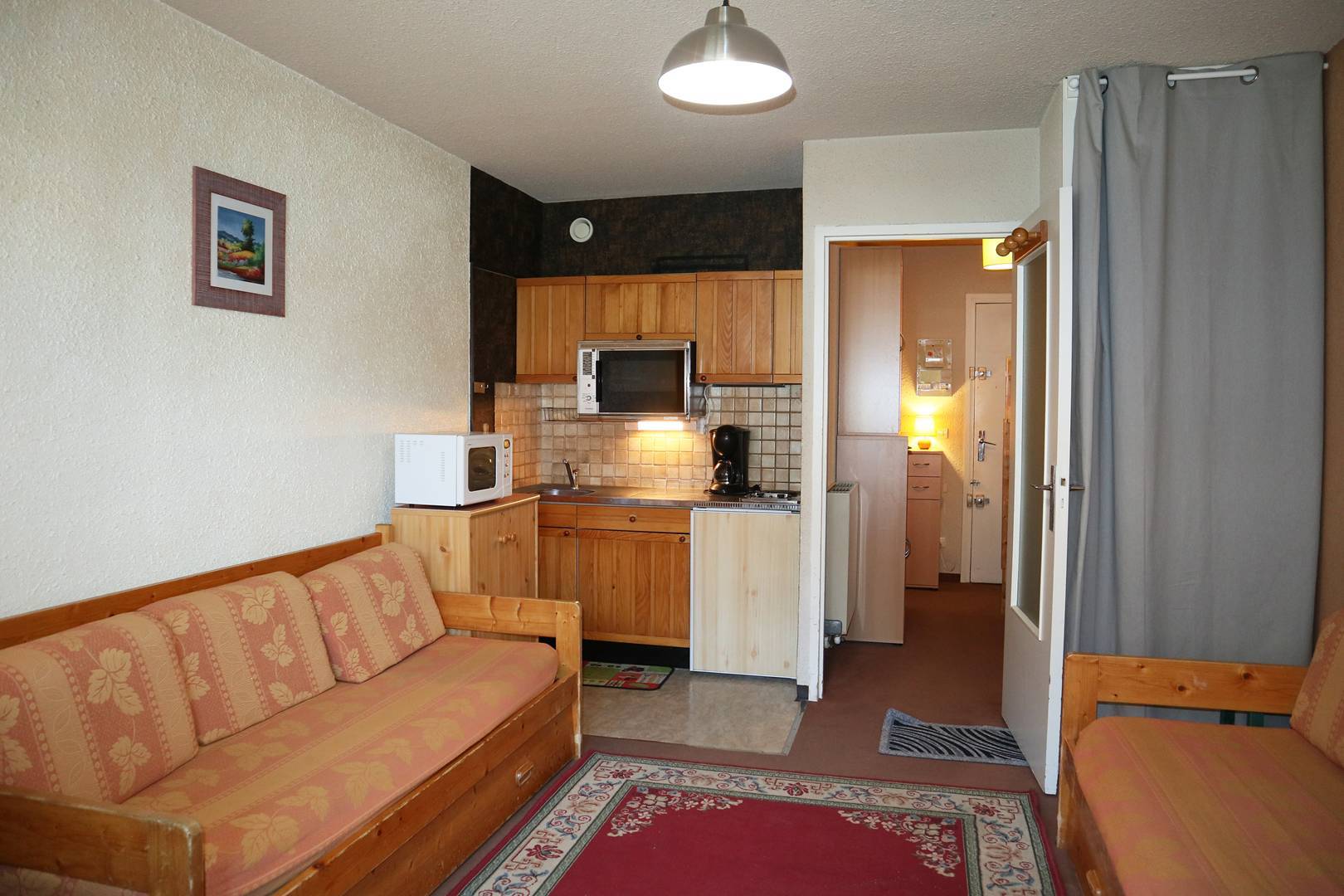 Studio équipé pour 4 personnes idéalement situé au départ des pistes, accès direct aux commerces et aux animations, 2 ème étage avec ascenseur, comprenant une entrée avec 2 lits superposés 1 place, un séjour avec 2 lits gigognes 1 place, un coin cuisine ouvert sur le séjour, une salle d'eau et WC. Balcon exposition Est offrant une belle vue sur la montagne et les pistes. Départ et retour skis aux pieds. Moquette au sol.