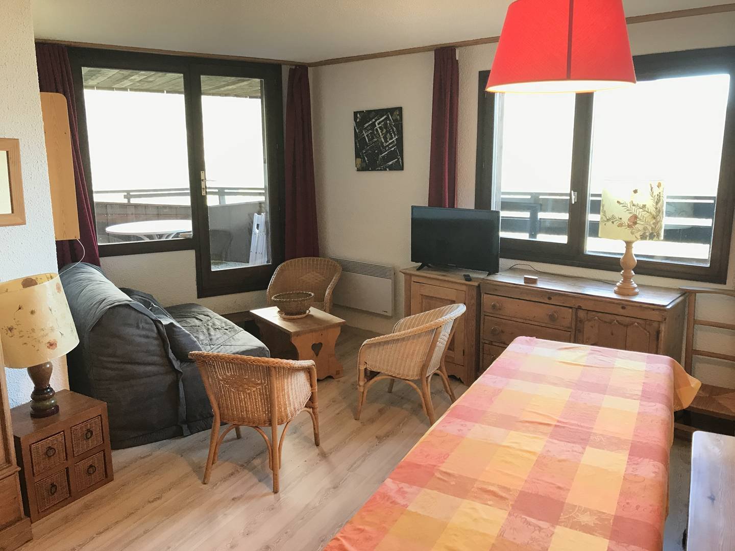 Grand studio équipé pour 4 personnes situé au 5ème étage de le résidence avec ascenseur, départ et retour skis aux peds à proximités de tous commerces, comprenant une entrée avec 2 lits superposés 1 place, un séjour avec 1 banquette convertible 2 places , un coin cuisine équipé ouvert sur le séjour, une salle de bains et wc indépendants. Balcon offrant une très belle vue exposition Sud sur la station et sur les pistes.