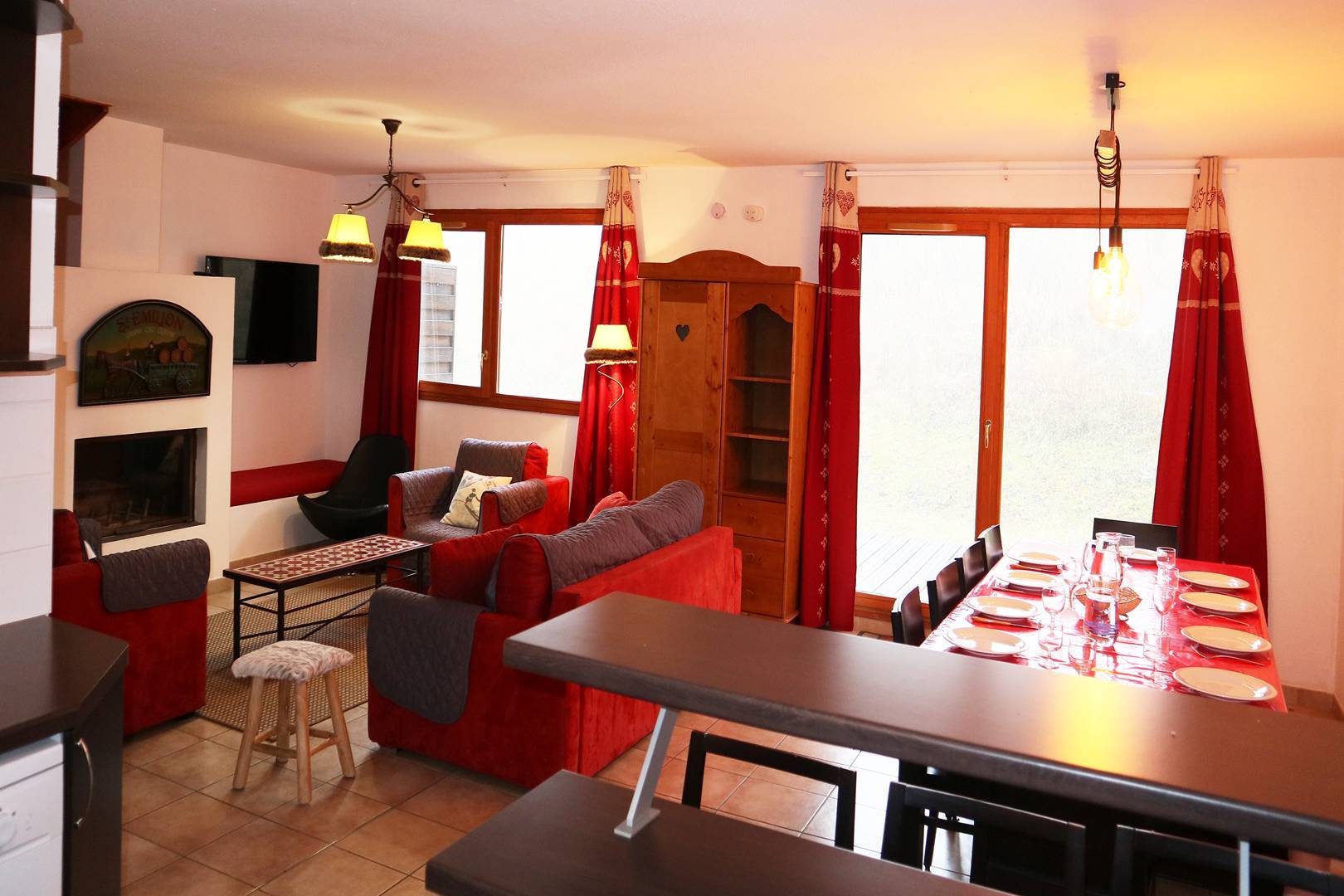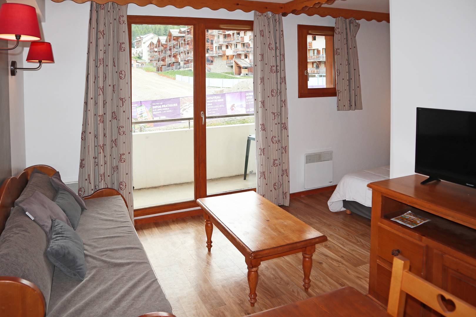 - un spacieux séjour pouvant être fermé, avec un canapé clic-clac 2 personnes d'un côté et 2 lits 1 place en face