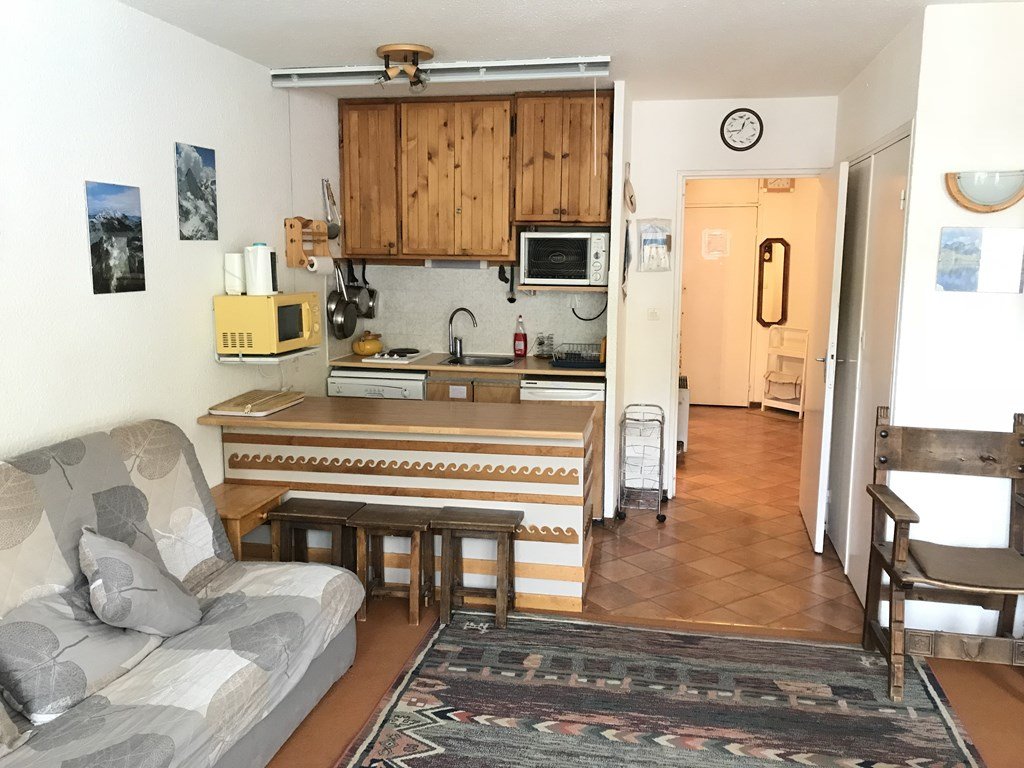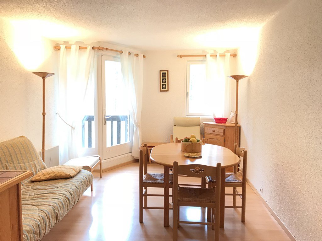Studio équipé pour 6 personnes composé d'une entrée avec 2x 2 lits superposés 1 place d'un séjour avec 1 banquette convertible 2 places, salle de bains et wc séparés, coin cuisine ouvert sur le séjour, balcon exposé sud offrant une vue montagne