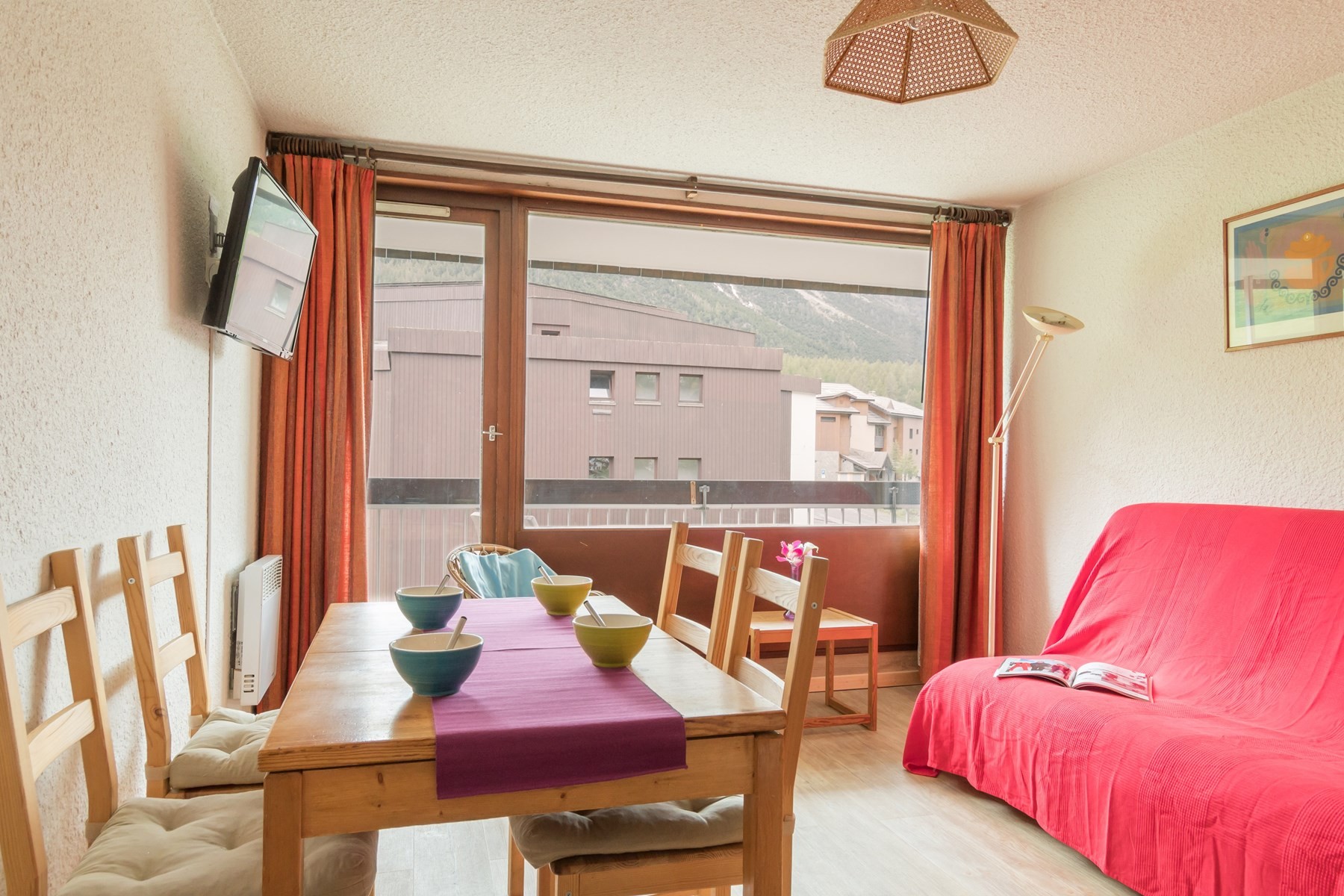 - d'un salon avec canapé convertible en 160 cm et télévision donnant sur un balcon plein sud avec vue sur les pistes,