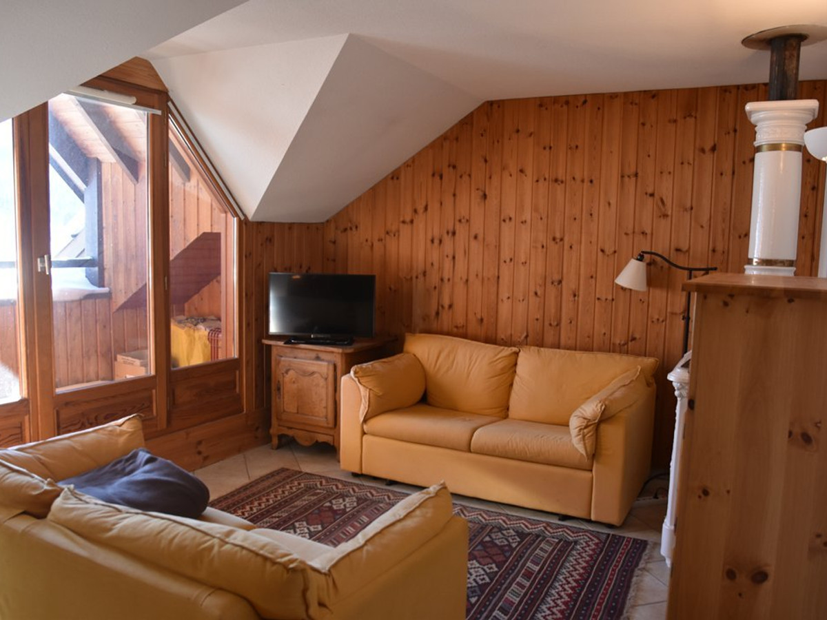 L'appartement est composé d'une entrée avec un placard dans lequel vous pourrez laisser manteaux et après-skis ; d'une salle de bain avec baignoire, lave-linge et sèche cheveux ; d'un wc séparé, d'un grand séjour avec un canapé convertible en 180 cm, une télévision, 2 fauteuils, 2 tables pour manger donnant sur un balcon plein sud d'où vous pourrez profiter de la vue et du soleil.