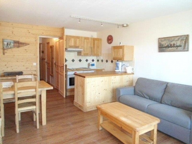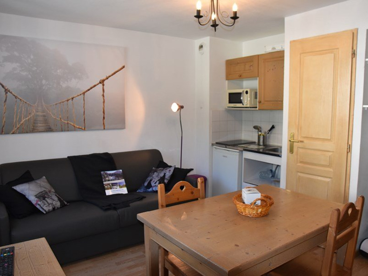 Il est composé d'une entrée avec un lit 2 places en mezzanine et un lit une place dessous ; une salle d'eau avec douche, wc séparé, un grand séjour avec canapé convertible en 140 cm , une télévision, et une cuisine toute équipée avec plaques vitrocéramiques, lave-vaiselle, micro-ondes, donnant sur un balcon exposition sud avec vue sur les pistes. La résidence est situé à 300m des commerces et des remontées mécaniques.