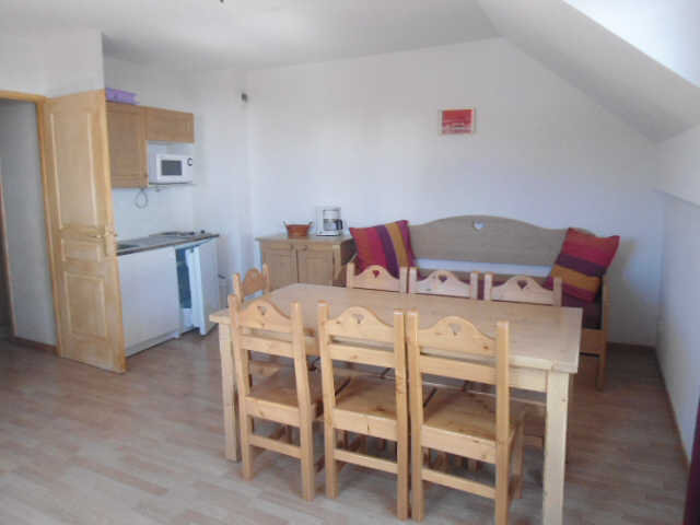 Résidence le plein soleil . Appartement 2 pièces + coin montagne, 35m², 5/6 personnes, 3ème étage, exposition sud. Balcon. Séjour avec 1 canapé lit 2 personnes. Chambre avec 2 lits d'une personne. Coin nuit avec 2 lits d'une personne superposés. Coin cuisine avec réfrigérateur, plaques électriques, micro ondes, lave-vaisselle . Salle d'eau avec douche et wc. Situé dans le haut du village, à 900m des pistes. Parking extérieur. Animaux interdits.