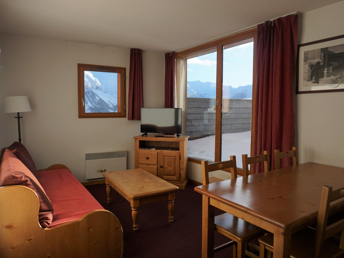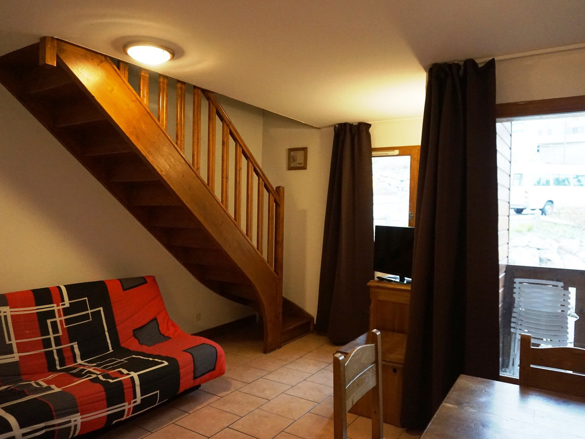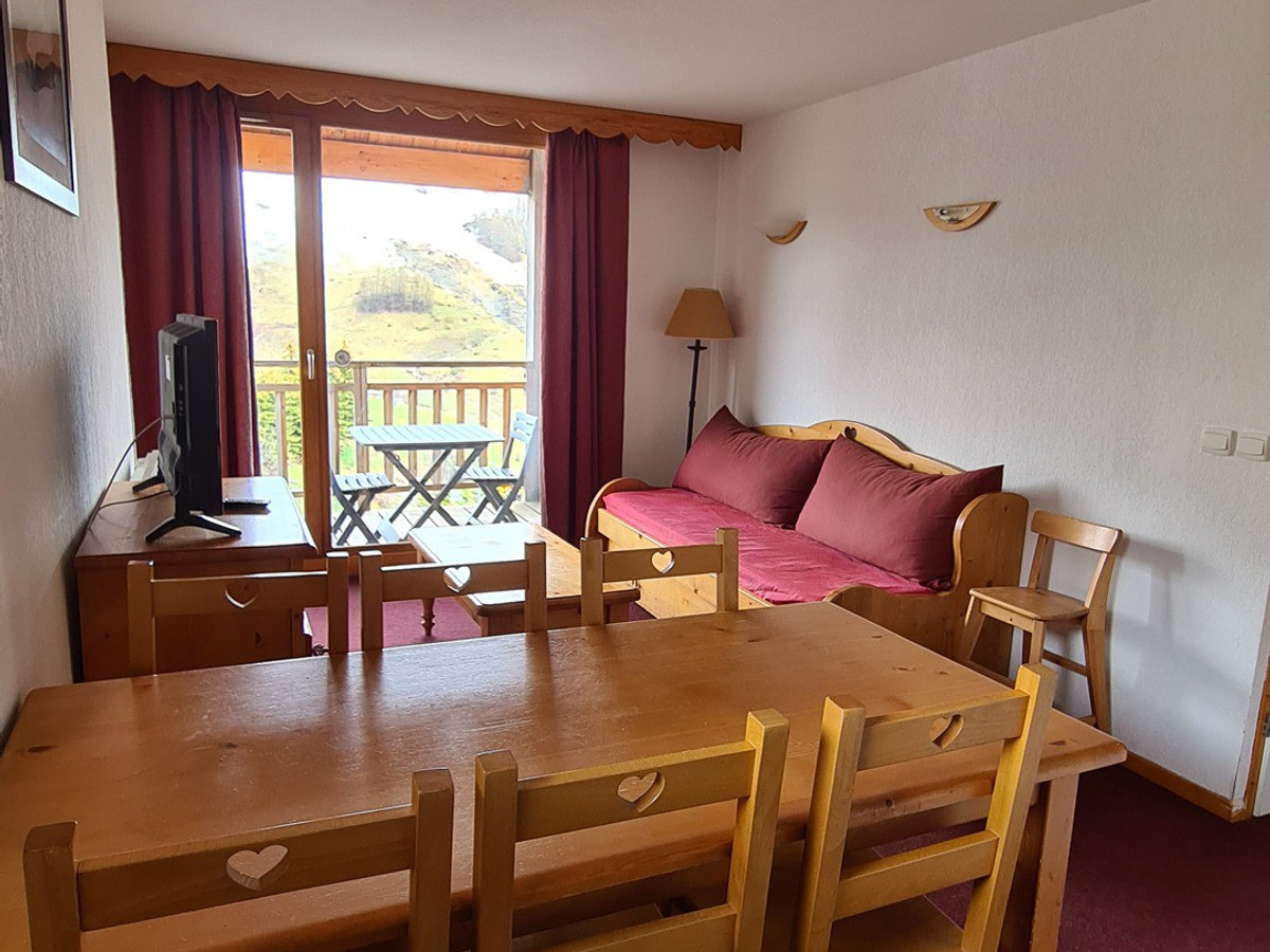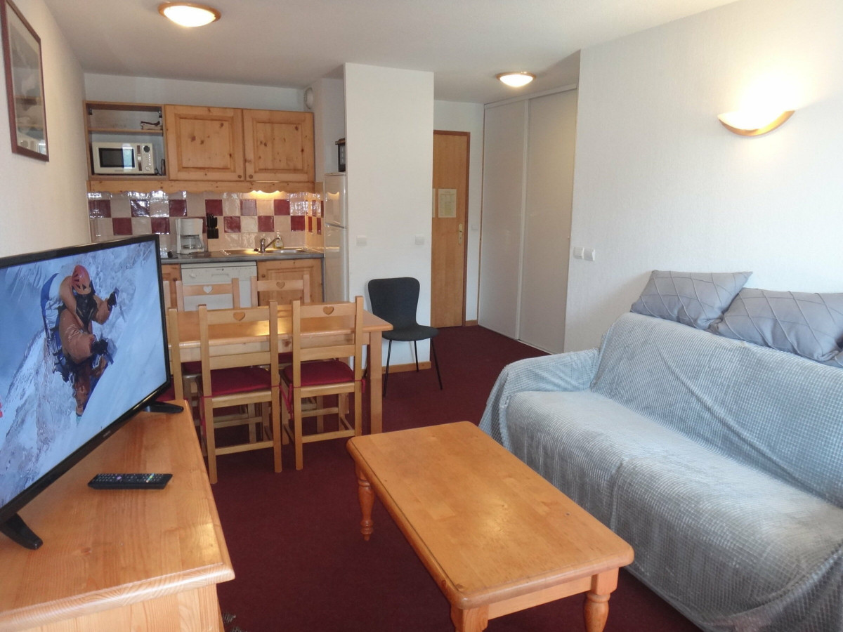 Couchages : clic-clac dans le séjour et lits superposés dans l'entrée séparée du séjour par une porte. Salle de bain (baignoire) et WC séparés. Equipé d'une TV.écran plat. Apt avec balcon exposé S-O au 2è étage avec ascenseur, avec vue sur le télésiège du soleil. Chauffage au sol collectif. Casier à ski au RDC.