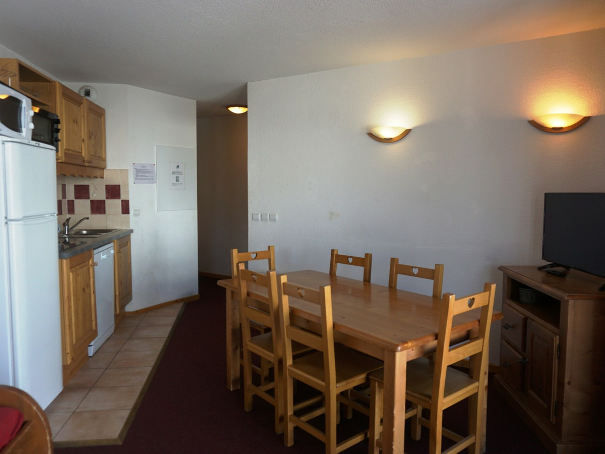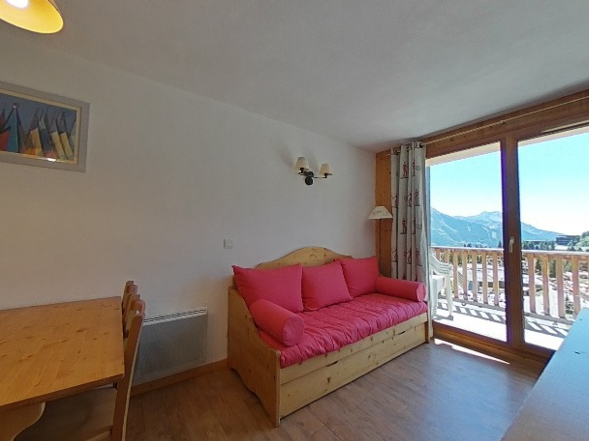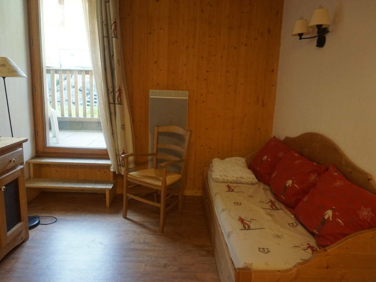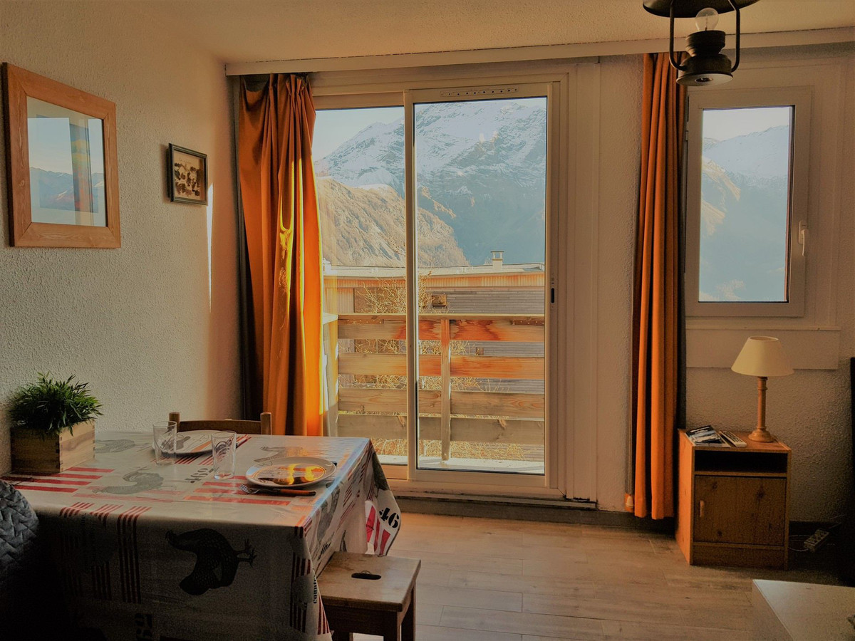 Couchages : clic-clac dans le séjour et lits superposés dans l'entrée séparée du séjour par une porte. Salle de bain (baignoire) et WC séparés. Equipé d'une TV.écran plat. Apt avec balcon exposé S-O au 2è étage avec ascenseur, avec vue sur le télésiège du soleil. Chauffage au sol collectif. Casier à ski au RDC.