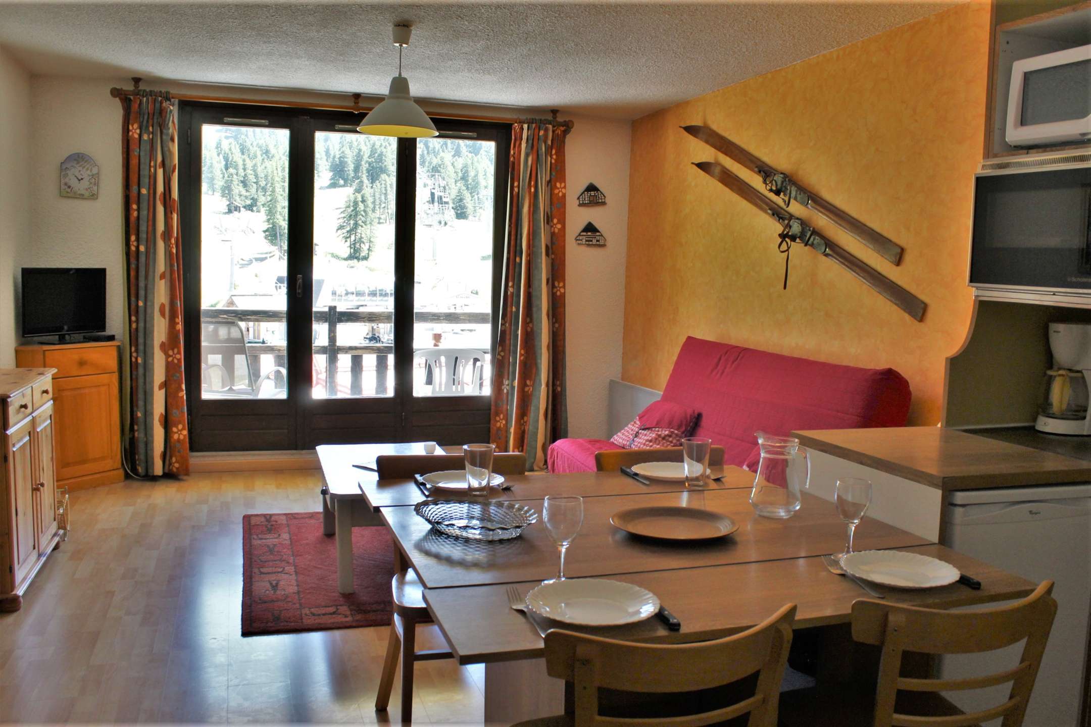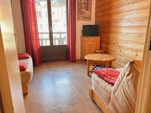 Dans une résidence située en pied de pistes et au centre de la station, cet appartement est agencé de la manière suivante : un coin montagne avec 2 lits superposés séparé du séjour par un rideau, une kitchenette ouvrant sur une pièce à vivre équipée d'une banquette lit gigogne 2 personnes (non séparable en 2 lits simples), une salle de bain avec baignoire et lavabo, et des WC indépendants. L'appartement dispose aussi d'un casier à ski.