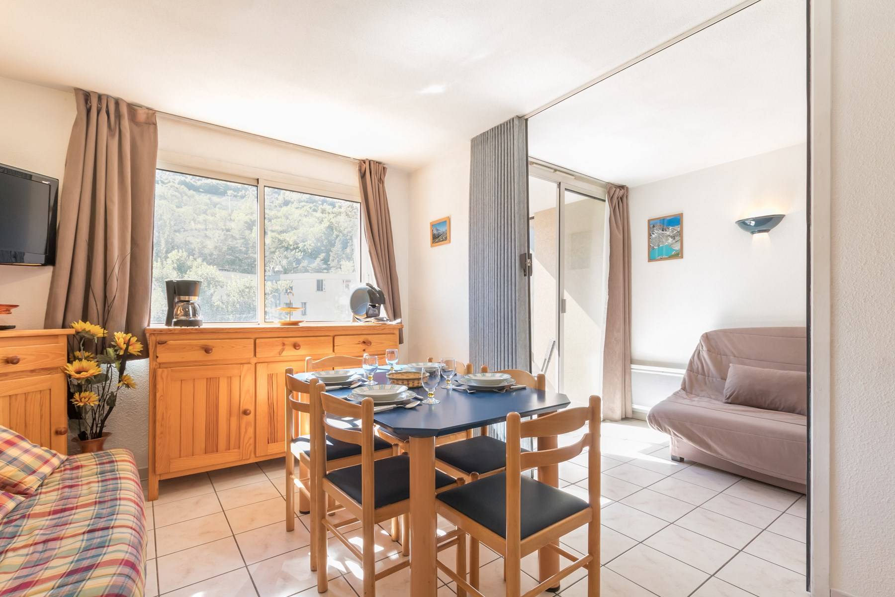 Il se compose d'une cuisine équipée avec four, micro-ondes, lave-vaisselle, cafetière, grille-pain.., d'un salon-séjour lumineux avec canapé lit BZ et donnant accès au balcon