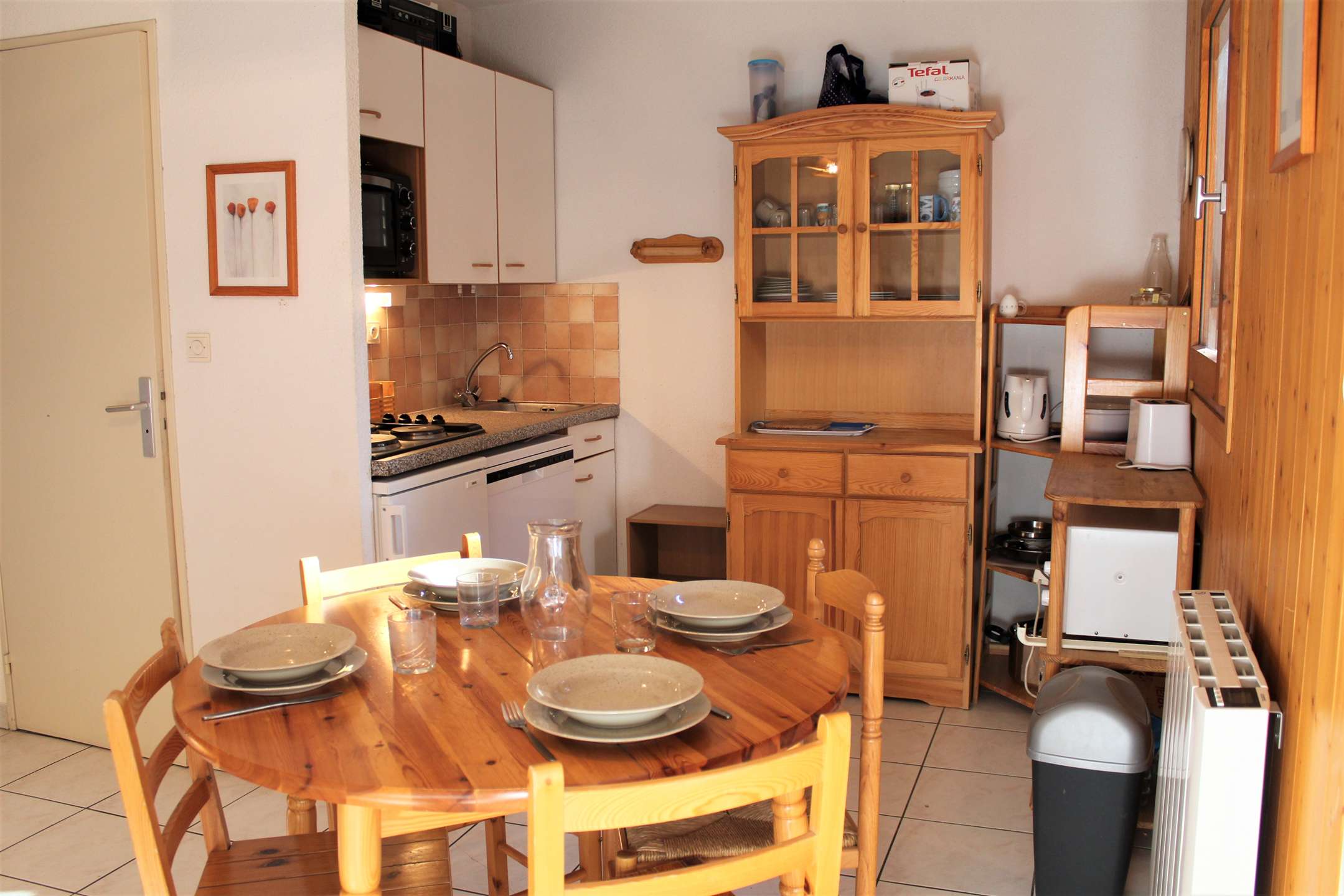 Cette location vacances avec un balcon exposé Sud, se compose d'un coin cuisine équipé ouvert sur un séjour avec un lit double. L'appartement dispose, à l'entrée, d'un coin montagne avec deux lits superposés d'une place (séparation avec rideau), ainsi qu'une salle d'eau et de WC indépendants.