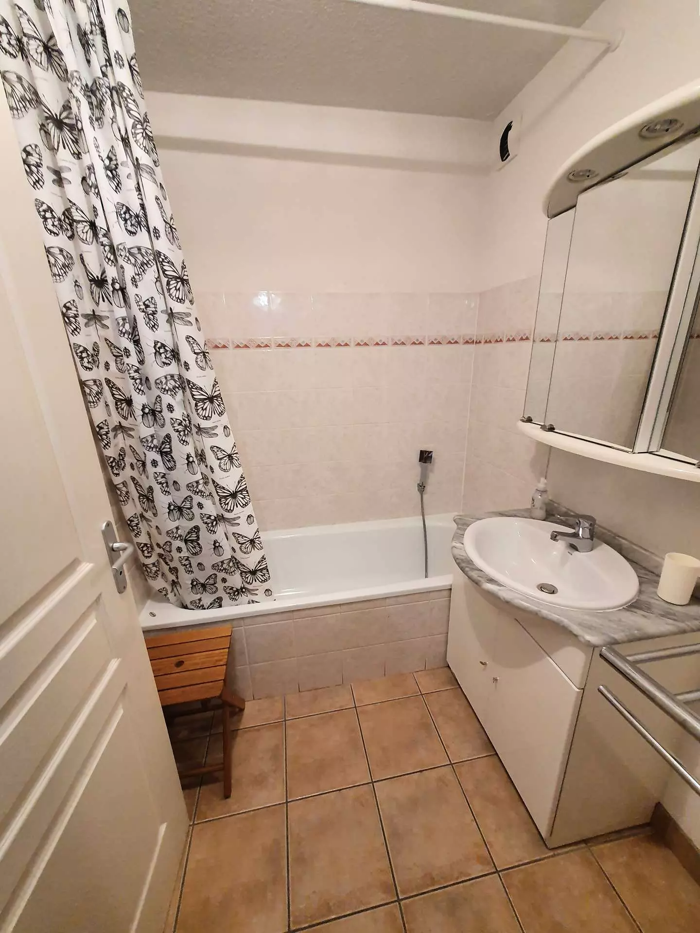 Cet appartement vacances se compose d'un séjour avec un coin cuisine équipé et d'un canapé convertible clic clac pour deux personnes. Sur la mezzanine vous trouverez deux lits jumeaux . La salle de bains possède une baignoire.