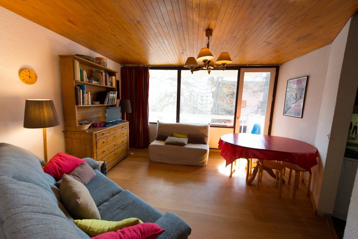 Appartement 2 pièces de 32m² équipé pour 4 personnes, situé au pied des pistes, exposé EST. Séjour avec canapé convertible en 140 et télévision. Chambre avec 2 lits gigognes en 90. Coin cuisine avec 2 plaques électriques et micro-ondes. Salle de bain avec baignoire et WC. Animaux non admis.