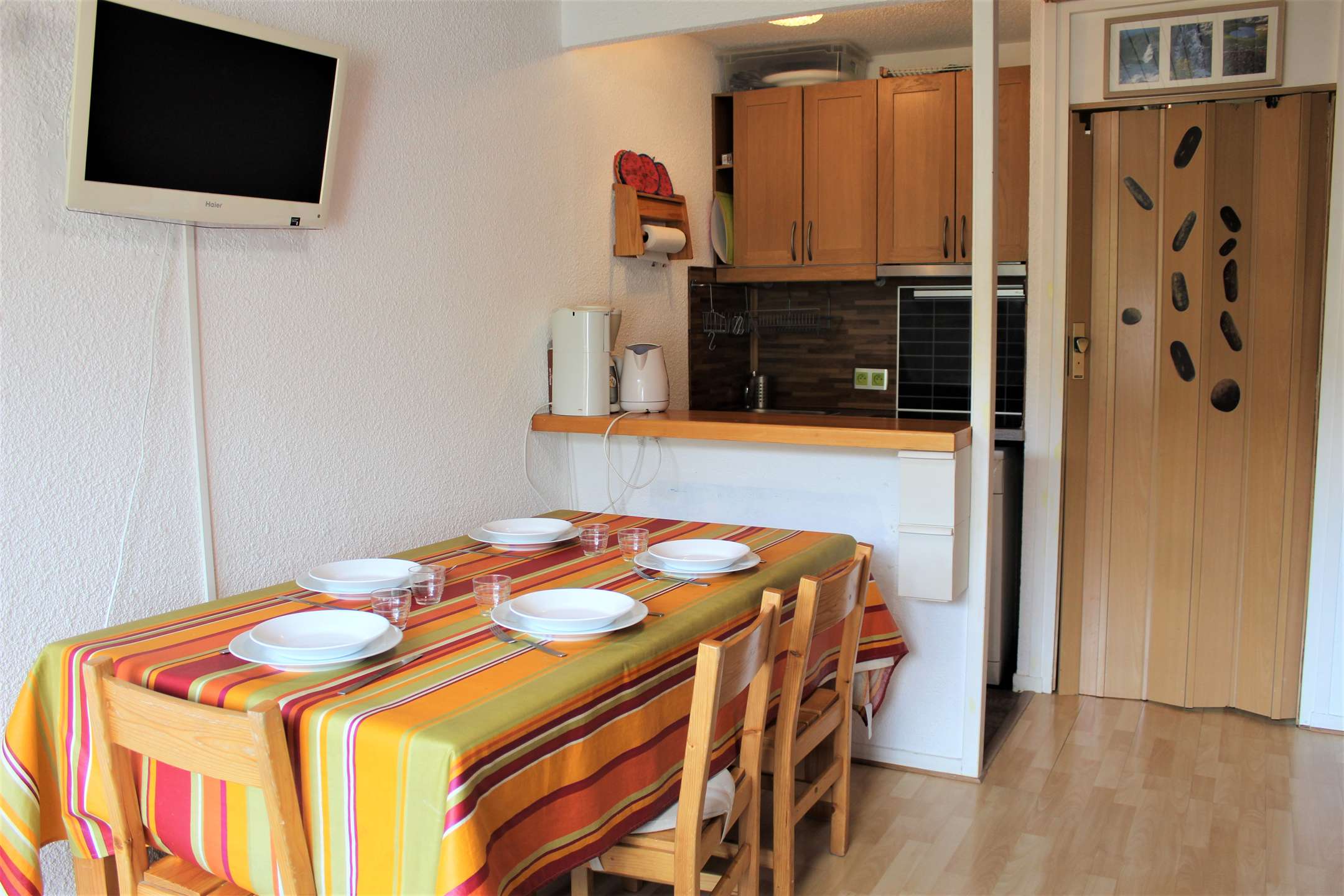 L'appartement se compose d'un coin cuisine équipée, d'un séjour avec canapé convertible deux personnes, d'un coin nuit avec un deux lits gigognes et d'une salle d'eau avec WC.
