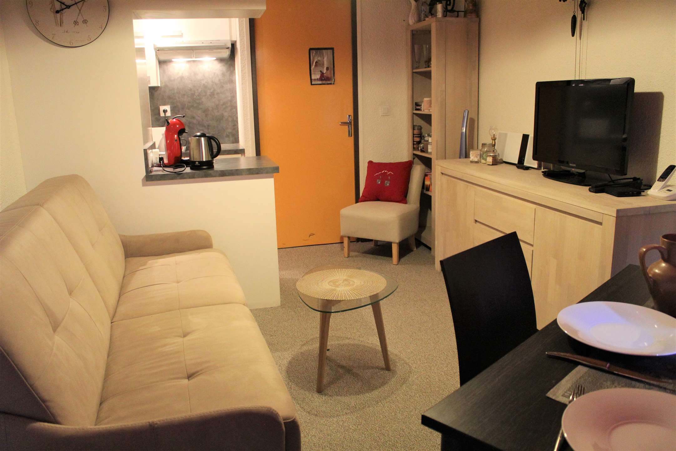 Cette location vacances à la montagne comprend un séjour avec un canapé convertible clic clac pour deux personnes, un coin montagne avec deux lits superposés une place. Un coin cuisine équipé ouvert sur le séjour. Une salle de bain avec WC séparés.