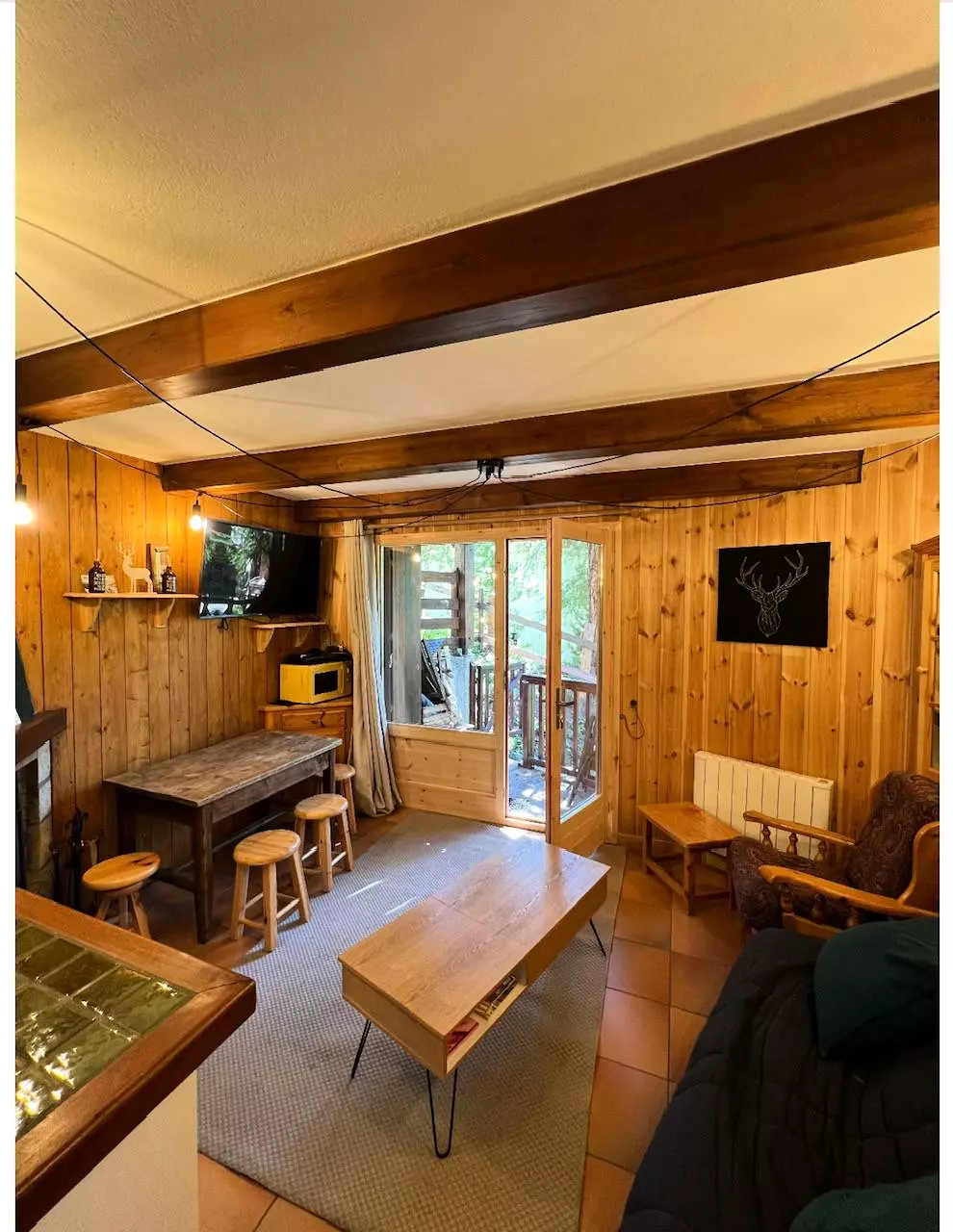 Composé d'un coin montagne ouvert avec deux lits superposés, 1 coin séjour salle à manger avec canapé lit, cuisine neuve toute équipée ouverte sur séjour, et une salle d'eau avec meuble vasque et cabine de douche