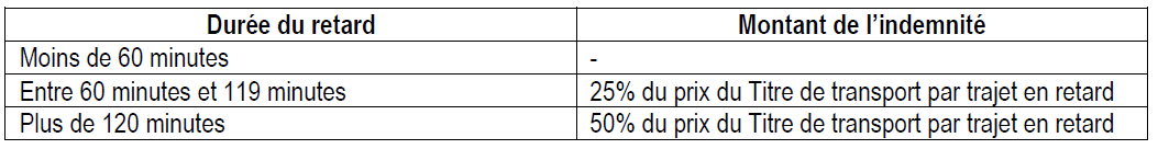 En vertu de la réglementation applicable, en cas de retard dans l’acheminement et sans remboursement du trajet, le Client peut obtenir une indemnité qui sera au minimum de :