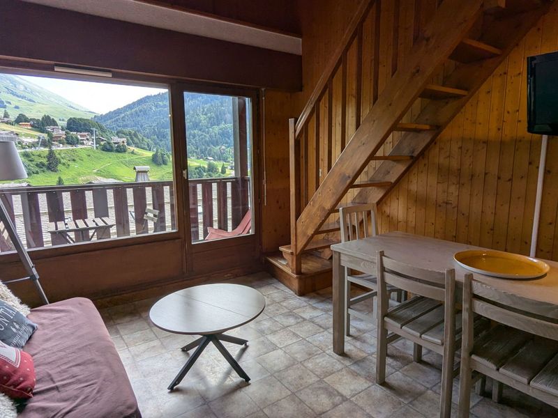 - Coin repas : table et chaises, porte-fenêtre donnant un grand balcon-terrasse avec vue sur le village et la chaine des Aravis