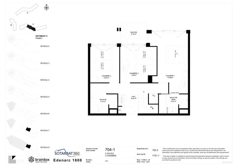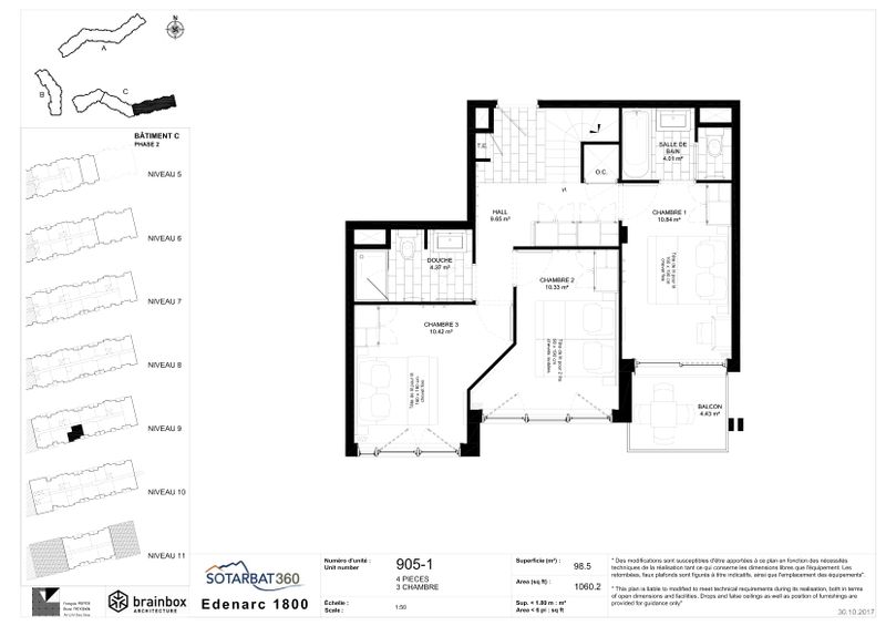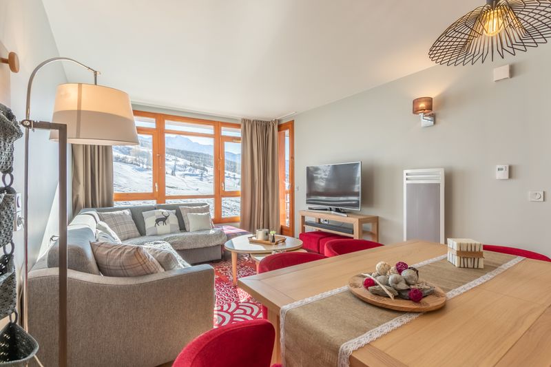 ARCS 1800 - Résidence premium 4* : L’Ecrin. Ambiance Contemporaine et Bois pour ce superbe appartement de 4 pièces, 80 m2, spacieux, moderne et lumineux, pour 8 personnes offrant une magnifique vue sur la vallée de la Tarentaise. Exposition Ouest. Résidence très récente et de standing avec prestations hôtelières, avec son espace détente : sauna, hammam et salle de fitness.