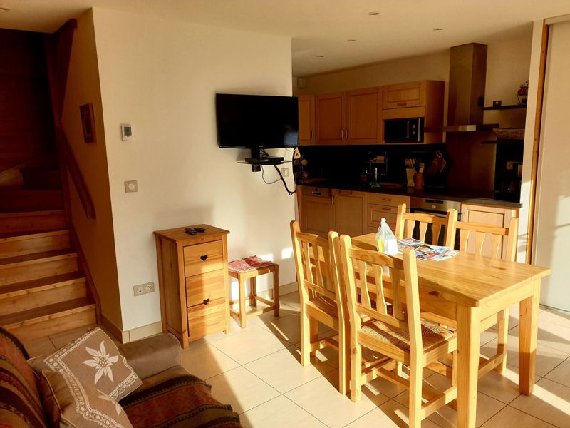 Résidence moderne "Lagrange Les Fermes Emiguy". 74 appartements dans la résidence. Dans la localité, à 400 m du centre, situation centrale, à 400 m des pistes de ski. En commun: piscine couverte chauffée (01.01.-31.12.). Jacuzzi. Infrastructures de la résidence: réception, accès internet, sauna (en sus). Salle fitness, ascenseur, réduit pour bicyclettes, chauffage central, lave-linge, sèche-linge (en commun, en sus). Accès en voiture (route de montagne). En hiver, merci de prévoir des chaînes. Place de parking (couvert, nombre de places limité, en hiver en sus). Dimension: hauteur 195 cm. Magasins, magasin d'alimentation, restaurant 400 m. Remontées mécaniques, domaine skiable 400 m. Les domaines skiables de renommée sont facilement accessibles: Kes Gets, Les portes du soleil, Châtel. Les lacs connus sont facilement accessibles: Lac Léman 20 km. Veuillez noter: voiture recommandée. Adapté(e) aux familles, équipement pour bébés sur demande (en sus). Ski-bus gratuit. La photo ne montre qu’un exemple de location de vacances. La photo du catalogue n´est qu´un exemple. D’autres appartements sont également proposés à la location dans cette maison de vacances. ¨Attention: sauna à 8 euros par appartement par séance. "26A/X", apt 2 pièces 35 à 52 m2. Aménagement agréable: séjour/salle à manger avec 1 divan-lit double (140 cm), TV. 1 chambre avec 1 grand-lit (140 cm). Alcôve avec 1 x 2 lits superposés. Coin cuisine (lave-vaisselle, 2 plaques vitrocéramique, four micro-ondes). Bain/douche/WC. Chauffage électrique. Balcon, terrasse. A disposition: Internet (Connexion WIFI, en sus). Place de parking (en sus). Adapté(e) aux familles. Maximum 2 animaux/ chiens autorisés.