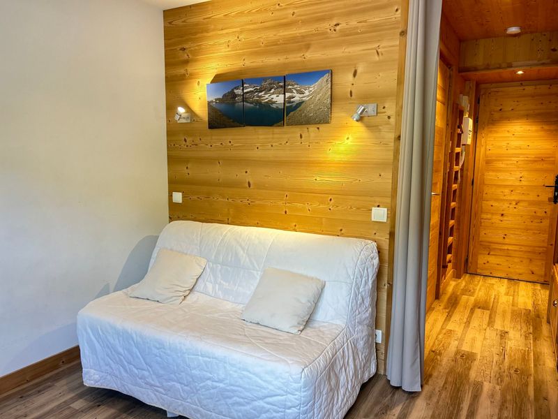 Coin salon avec canapé convertible et TV.