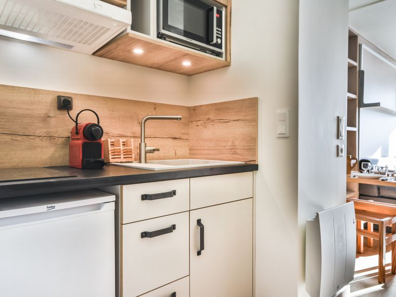 Séjour avec cuisine équipée : Lave vaisselle, micro-ondes, réfrigérateur, plaque vitrocéramique, Cafetière, Bouilloire, Grille-Pain
