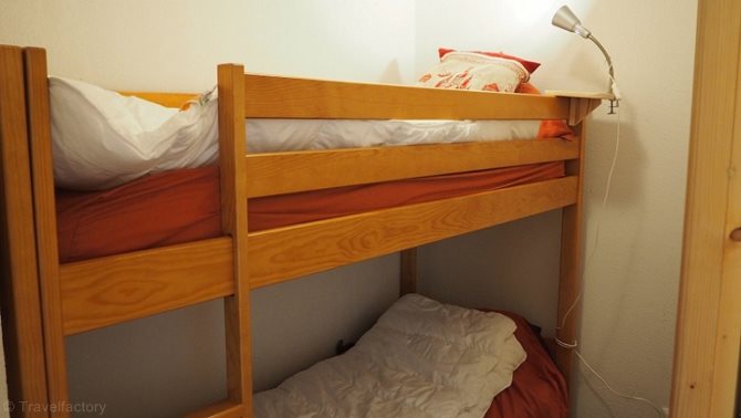Appartement 2 pièces pour 4 personnes, de 25m2, au 2ème étage avec balcon, exposition ouest. Couchages: lits superposés dans la cabine (fermée par une porte) et banquette lit + lit gigogne dans la séjour.