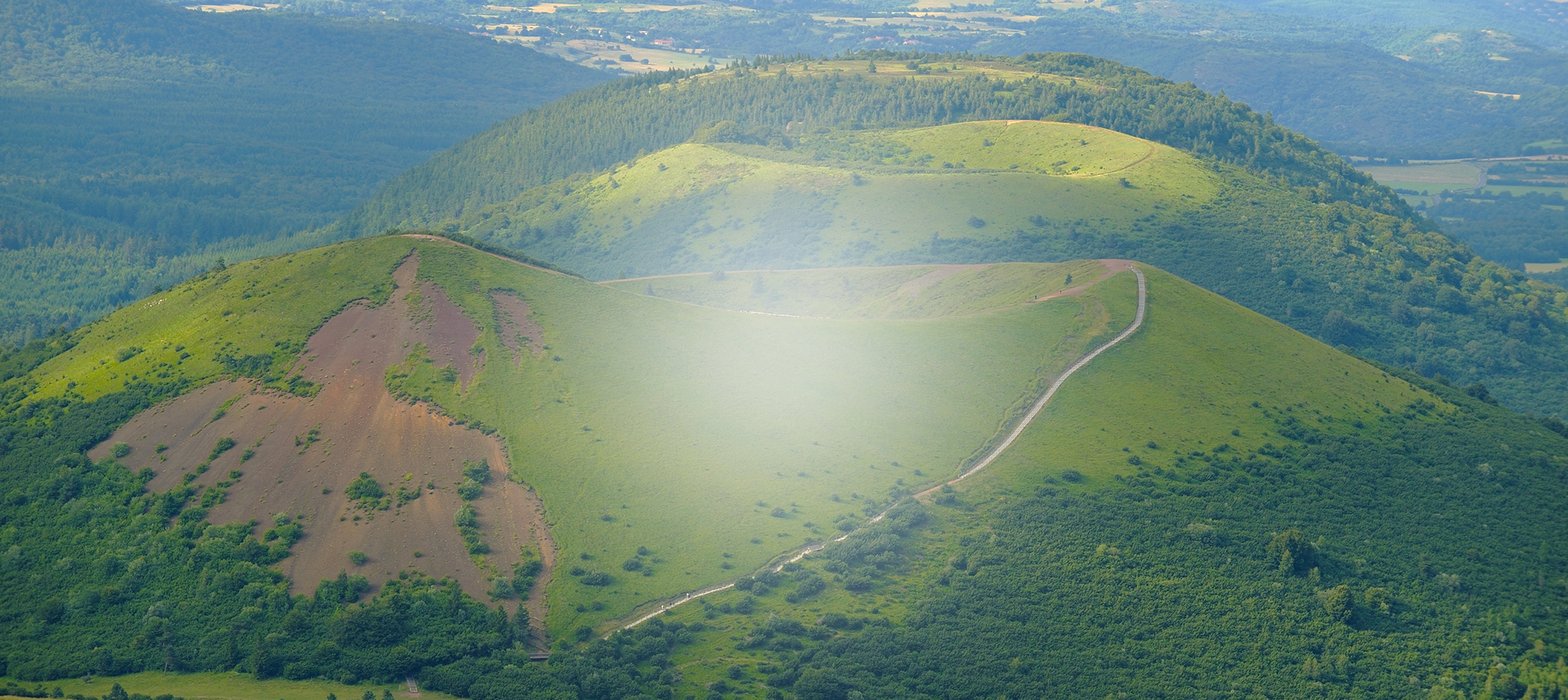 Lors de vos expéditions vous aurez l'occasion de découvrir l'emblématique Chaîne des Puys qui regroupe plus 80 volcans dont le fameux Puy de Dôme à 1465 mètres d'altitude ! D'ailleurs depuis 2018, la région naturelle a été reconnue par le patrimoine mondial de l'UNESCO. Retrouvez les Mont Dômes du nord au sud ainsi qu'à l'ouest de Clermont-Ferrand et de la plaine de la Limagne pour découvrir des panoramas exceptionnels. Cette région est recouverte de forêts omniprésentes ainsi que de pelouses pâturées.