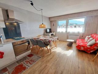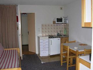 Kitchenette équipée (plaque de cuisson 2 feux, lave-vaisselle, bouilloire, cafetière Nespresso, four, micro-ondes, grille-pain) Séjour avec canapé convertible (140cm) , accès sur le balcon. 2 lits superposés à l'entrée (80cm) Salle de bain WC séparés