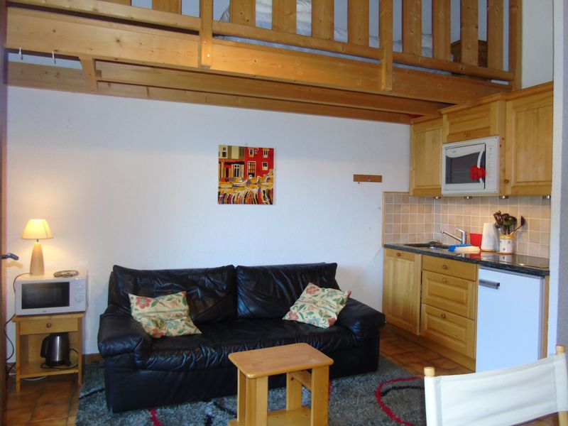 Apt 2 pièces 40 m2 sur 2 niveaux au 2ème étage: séjour/salle à manger. Entrée avec 1 x 2 lits superposés. Coin cuisine (4 plaques de cuisson, mini-four, lave-vaisselle, four micro-ondes). Salle de bains, WC séparé. À l'étage supérieur: petit salon mansardé, ouvert, hauteur plafond 175 - 255 cm avec fenêtre sous le toit, 1 lit gigogne (2 pers.), TV. 1 chambre, mansardée avec fenêtre sous le toit, 1 grand-lit. Chauffage électrique. Balcon, situation sud. Vue sur les montagnes et la vallée. Maximum 1 animal/ chien autorisé. L'appartement se situe dans le bâtiment H.