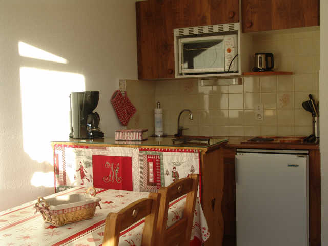 Appartement de 28 m² composé : entrée coin-montagne avec 2 lits rabattables, une chambre 1 lit double, une salle de bain avec baignoire et wc séparé, coin cuisine équipé d'1 réfrigérateur, 4 plaques, 1 four, ouvert sur pièce de vie, canapé, avec télévision. donnant sur belle terrasse exposée Sud-Ouest avec vue sur les pistes.