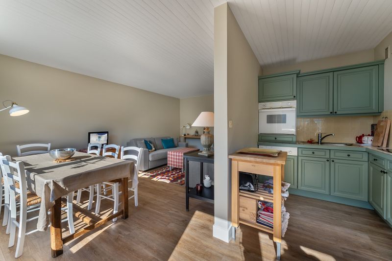 L'espace de vie bénéficie d'une salle à manger avec baie vitrée sur un balcon sud avec vue, d'un coin salon avec télévision, d'une cuisine entièrement équipée.
