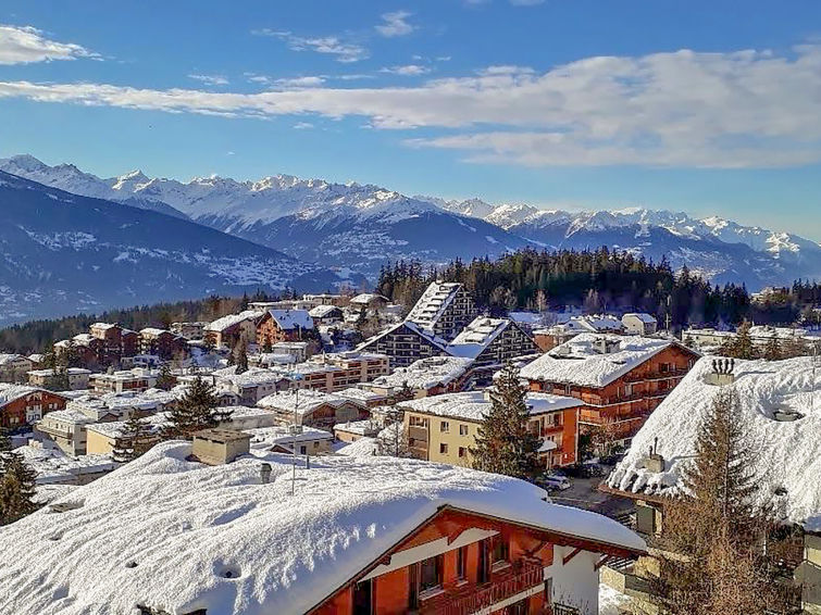 Les Briesses à 2 km de Crans: Immeuble "Grand-Air". Dans le bas de la station de Crans, dans le quartier de "Les Briesses", sur une route principale. Infrastructures de la Maison: ascenseur, local pour les skis, lave-linge, sèche-linge (en commun, en sus). Place de parking No 9 près de la maison. Arrêt de bus "Les Briesses" 200 m. Terrain de golf 2 km, remontées mécaniques 3 km. Apt 3 pièces 72 m2 au 2ème étage. Séjour/salle à manger avec cheminée et TV (écran plat). 2 chambres, chaque chambre avec: 2 lits. Cuisine (3 plaques de cuisson, four, lave-vaisselle, four micro-ondes, cafetière électrique) avec passe-plat. Douche/bidet/WC, WC séparé. Balcon, situation sud et situation ouest. Meubles de terrasse. Vue sur les montagnes. A disposition: sèche-cheveux. Internet (Connexion WIFI, gratuit). Place de parking No 9 près de la maison. Veuillez noter: logement pour non fumeurs.